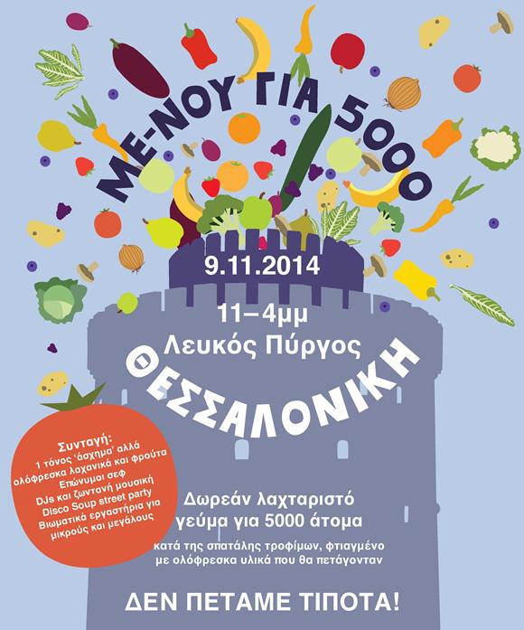 Γνωρίζετε πως χιλιάδες κιλά φρέσκων λαχανικών πετιούνται επειδή δεν είναι εμφανίσιμα ή επειδή περισσεύουν; Πάνω από το 1/3 της παγκόσμιας παραγωγής τροφίμων σπαταλάται από τους αγρούς μέχρι τα νοικοκυριά και τα εστιατόρια επειδή δεν καλύπτει τα αισθητικά κριτήρια της αγοράς, ενώ κάθε νοικοκυριό στην Ελλάδα σπαταλά 98,9 κιλά τροφίμων ανά άτομο σε ετήσια βάση. Την αλόγιστη συμπεριφορά αυτή έρχεται να αντιμετωπίσει το Με-Νού για 5000 (Feeding the 5000), μια παγκόσμια εκστρατεία για την καταπολέμηση της σπατάλης τροφίμων, που την Κυριακή 9 Νοεμβρίου στoν Λευκό Πύργο από τις 11 το πρωί μέχρι τις 4 το απόγευμα θα προσφέρει ένα δωρεάν γεύμα για 5000 πολίτες, φτιαγμένο με ολόφρεσκες πρώτες ύλες που δε θα καταναλώνονταν γιατί δεν έφτασαν στην αγορά λόγω εμφάνισης ή περισσεύματος.