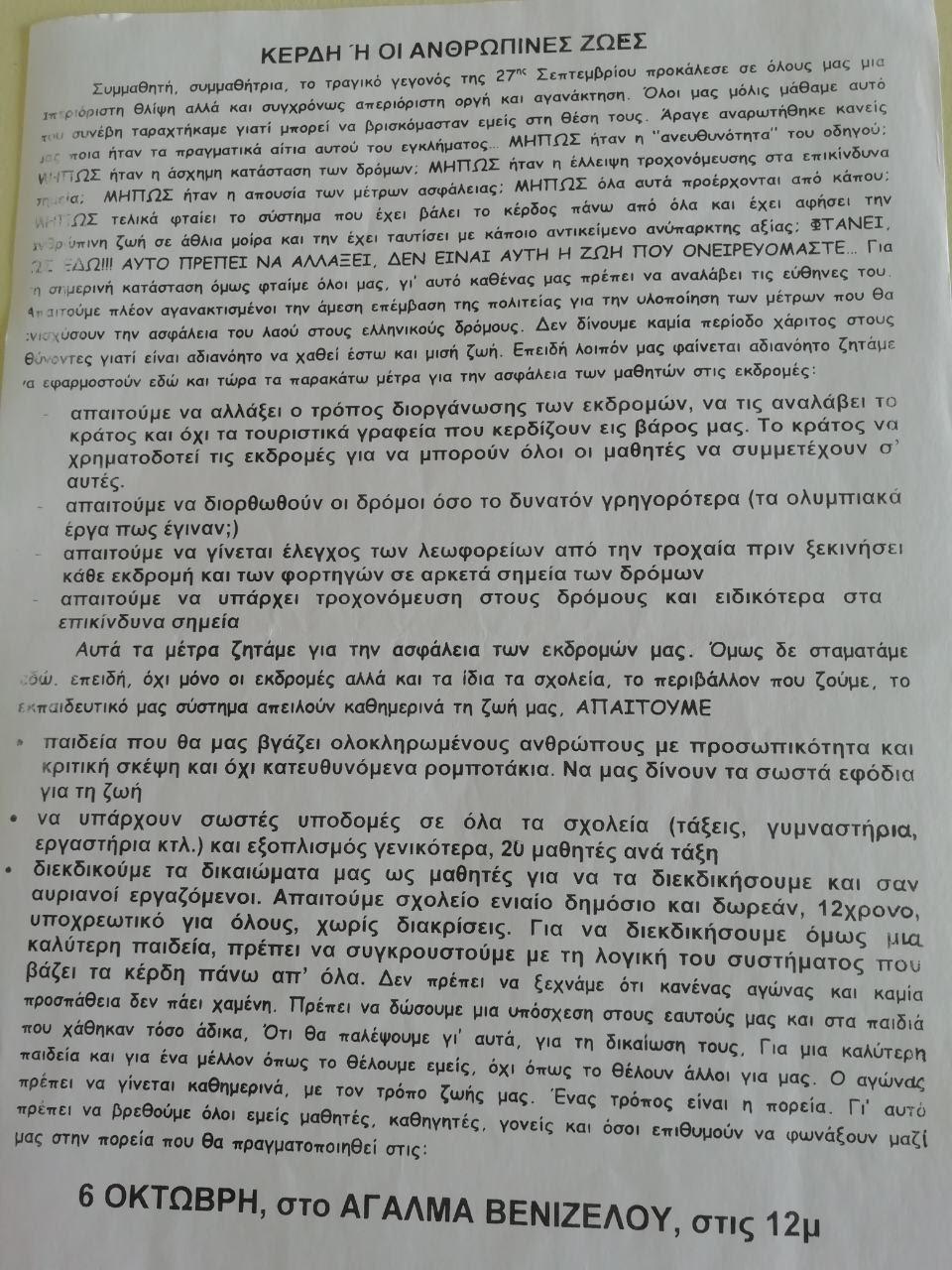 Κλείνω αυτό το μικρό σημείωμα-φόρο τιμής στη μνήμη των 21 μαθητών που χάθηκαν τόσο άδικα με τα λόγια της ανακοίνωσης (φωτό) που είχαμε γράψει: «Απαιτούμε σχολείο ενιαίο, δημόσιο και δωρεάν, υποχρεωτικό για όλους χωρίς διακρίσεις. Για να διεκδικήσουμε όμως καλύτερη παιδεία, πρέπει να συγκρουστούμε με τη λογική του συστήματος που βάζει τα κέρδη πάνω απ’ όλα. Δεν πρέπει να ξεχνάμε ότι κανένας αγώνας και καμιά προσπάθεια δεν πάει χαμένη. Πρέπει να δώσουμε υπόσχεση στους εαυτούς μας και στα παιδιά που χάθηκαν τόσο άδικα ότι θα παλέψαμε γι’ αυτά για τη δικαίωσή τους. Για μια καλύτερη παιδεία και για ένα μέλλον όπως το θέλουμε εμείς, όχι όπως το θέλουν άλλοι για εμάς. Ο αγώνας πρέπει να γίνεται καθημερινά, με τον τρόπο ζωής μας…».
