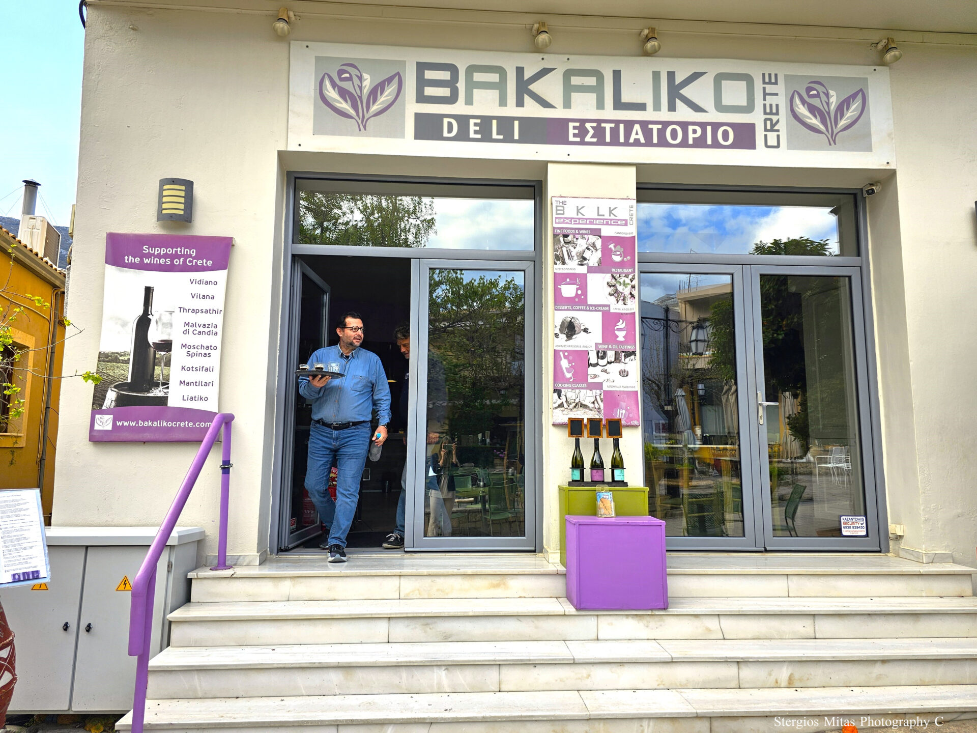 Πήρε να βραδιάζει αρχίσαμε να πεινάμε και πήγαμε στην πλατεία του χωριού στο Bakaliko. Εδώ ο Γιώργος Κτενιαδάκης μαζί με την γυναίκα του έστησαν στην αρχή ένα παραδοσιακό Μπακάλικο, που μετά έγινε και εστιατόριο με εξειδίκευση στα Κρητικά κρασιά. Το Bakaliko έχει μόνο Κρητικά κρασιά από γηγενείς ποικιλίες, ναι όσο περίεργο και αν σου φαίνεται. Ο Γιώργος είναι απίστευτος γνώστης του Κρητικού αμπελώνα, ξέρει όλα τα οινοποιεία και τι κρασιά κάνουν. Έτσι μπορεί να σου προτείνει να δοκιμάσεις εξαιρετικά κρασιά στο εστιατόριο του και τα προσφέρει σε χαμηλές τιμές. Και αυτός είναι ο λόγος που έφτασε να διακινεί τόσες φιάλες κρασί όσες και ένα μικρό οινοποιείο. Το Bakaliko το προτείνουν μεγάλοι ταξιδιωτικοί οδηγοί και έτσι έγινε γνωστό παγκοσμίως. Εδώ έρχονται από όλο τον κόσμο και αφήνονται στα χέρια του να τους μάθει το Κρητικό κρασί και τις ποικιλίες του. Πίνοντας και συζητώντας μας είπε ότι έχει ιδιαίτερη αγάπη για τις γηγενείς ποικιλίες Μαντηλάρι και Βιλάνα. Όσο μείναμε στην Κρήτη προσπάθησα να αποκτήσω άποψη για τις γηγενείς ποικιλίες του Κρητικού αμπελώνα και δοκιμάσαμε με την Αρετή εξαιρετικά κρασιά.