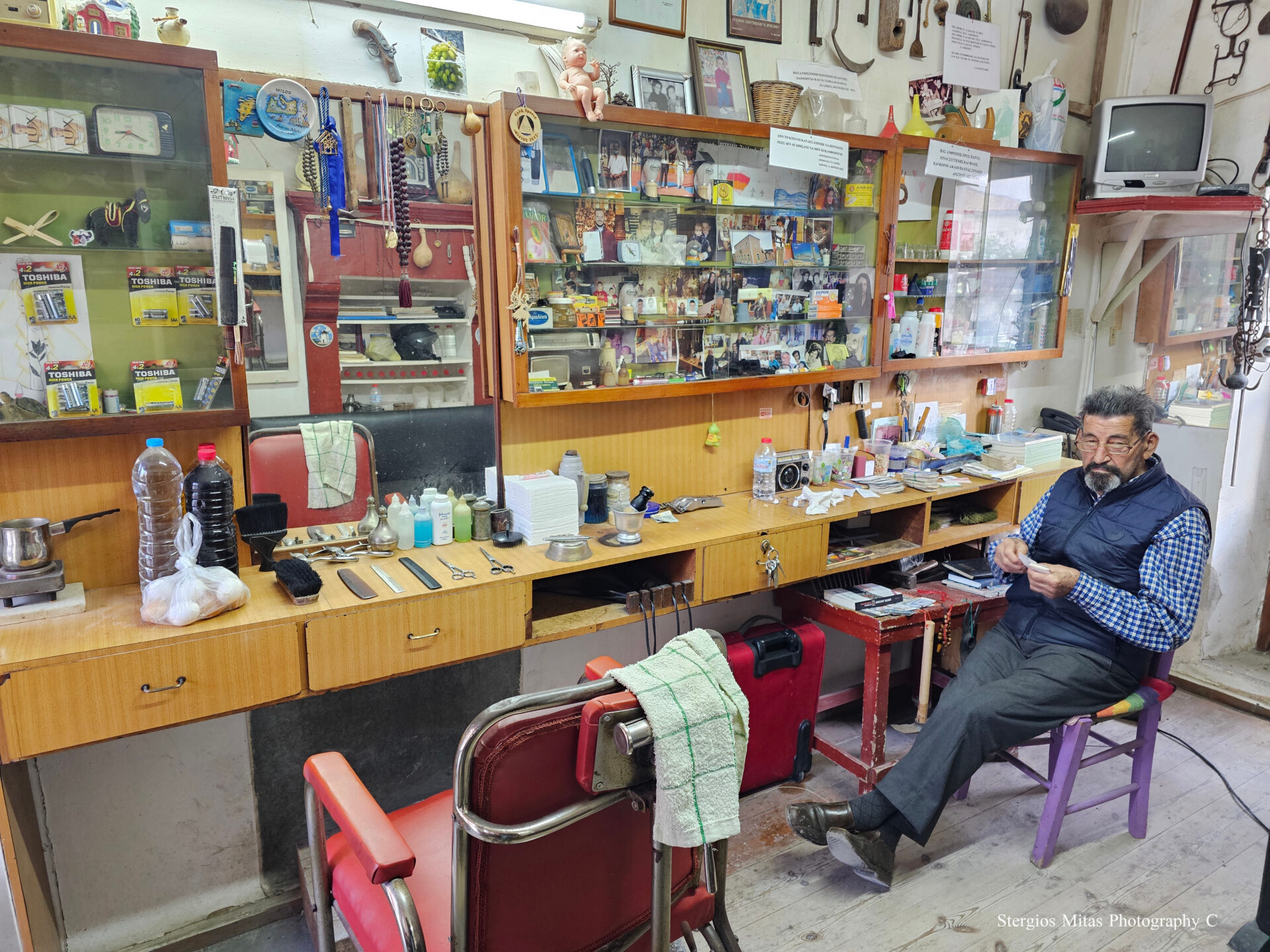 Κατεβήκαμε αργά το απόγευμα από το βουνό Γιούχτας και πήγαμε στις Αρχάνες στο κουρείο του κ Μανώλη. Το είχα δει το πρωί το κουρείο και μου έκανε μεγάλη εντύπωση έτσι όπως ήταν αναλλοίωτο από τον χρόνο. Ο χώρος έχει ιστορία πάνω από 200 χρόνια και κάποτε ήταν ρακάδικο και μπακάλικο. Ο κ Μανώλης μας καλωσόρισε με μια τσικουδιά και μας είπε ότι είναι πενήντα τρία χρόνια κουρέας. Μας μίλησε για το πόσο σημαντική είναι η αγάπη για την ζωή μας. Να αγαπάμε τον εαυτό μας, τους άλλους ανθρώπους αλλά και όλα τα πλάσματα της φύσης. Πριν λίγα χρόνια άλλαξε σπίτι και στο προηγούμενο είχε παρέα πολλά πουλιά στον κήπο του, τα ήθελε όμως και στο καινούργιο σπίτι, τους έριξε λοιπόν σπόρους σε όλη την διαδρομή και τον ακολούθησαν και ήρθαν στο καινούργιο σπίτι ,έτσι τα έχει πάλι παρέα και τα φροντίζει.