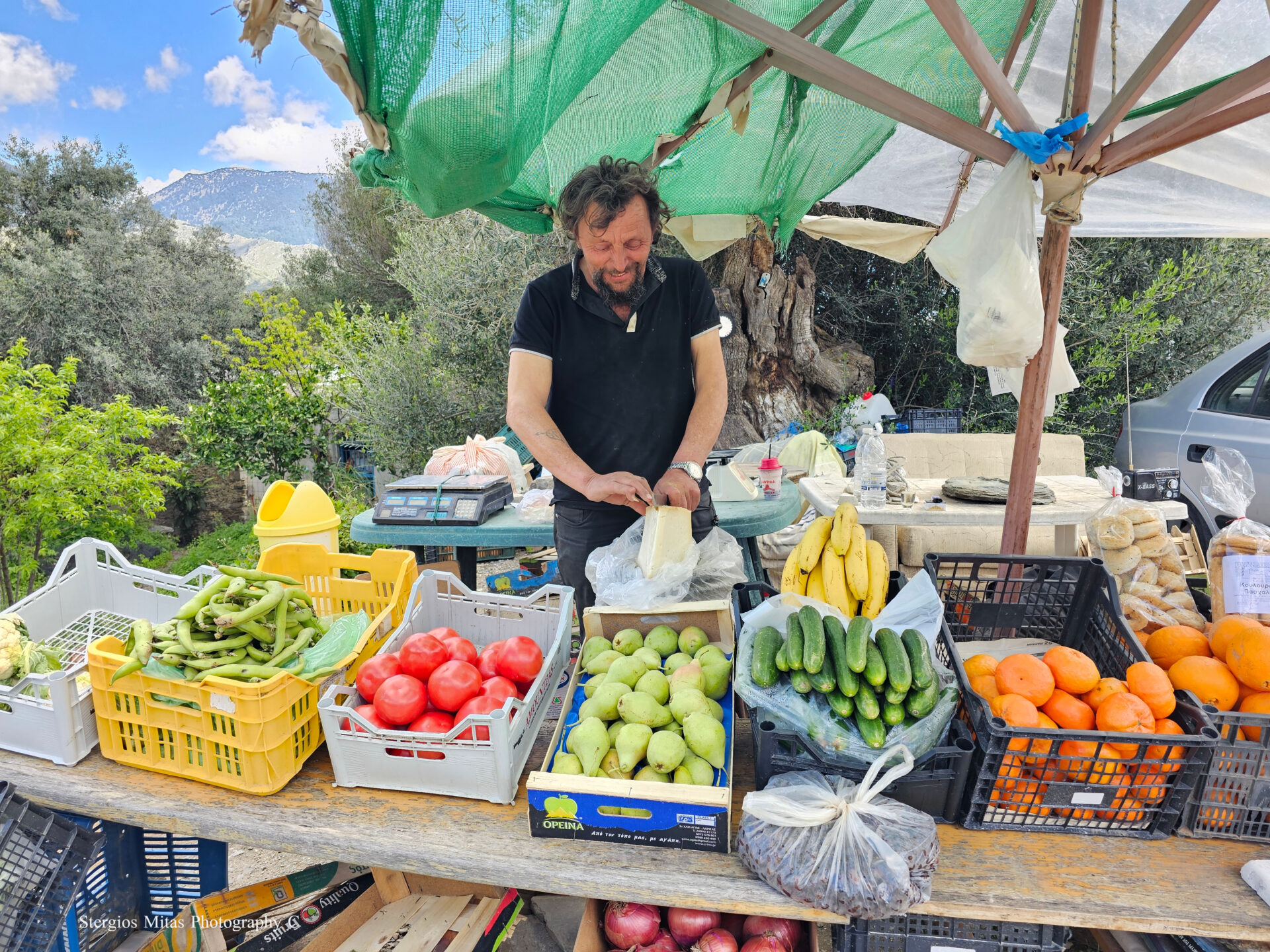 Έξω από ένα ορεινό χωριό συναντήσαμε τον μοναδικό πωλητή δρόμου σε όλο το ταξίδι μας. Μου αρέσει πάρα πολύ να αγοράζω ντόπια προϊόντα από υπαίθρια μικρά μανάβικα. Ο Ευτύχης ξέρει τους παραγωγούς της περιοχής και είχε καλά ντόπια προϊόντα, ήταν ίσως τα καλύτερα που αγοράσαμε στην Κρήτη. Ειδικά η γραβιέρα και οι ελιές του θα μας λείψουν.