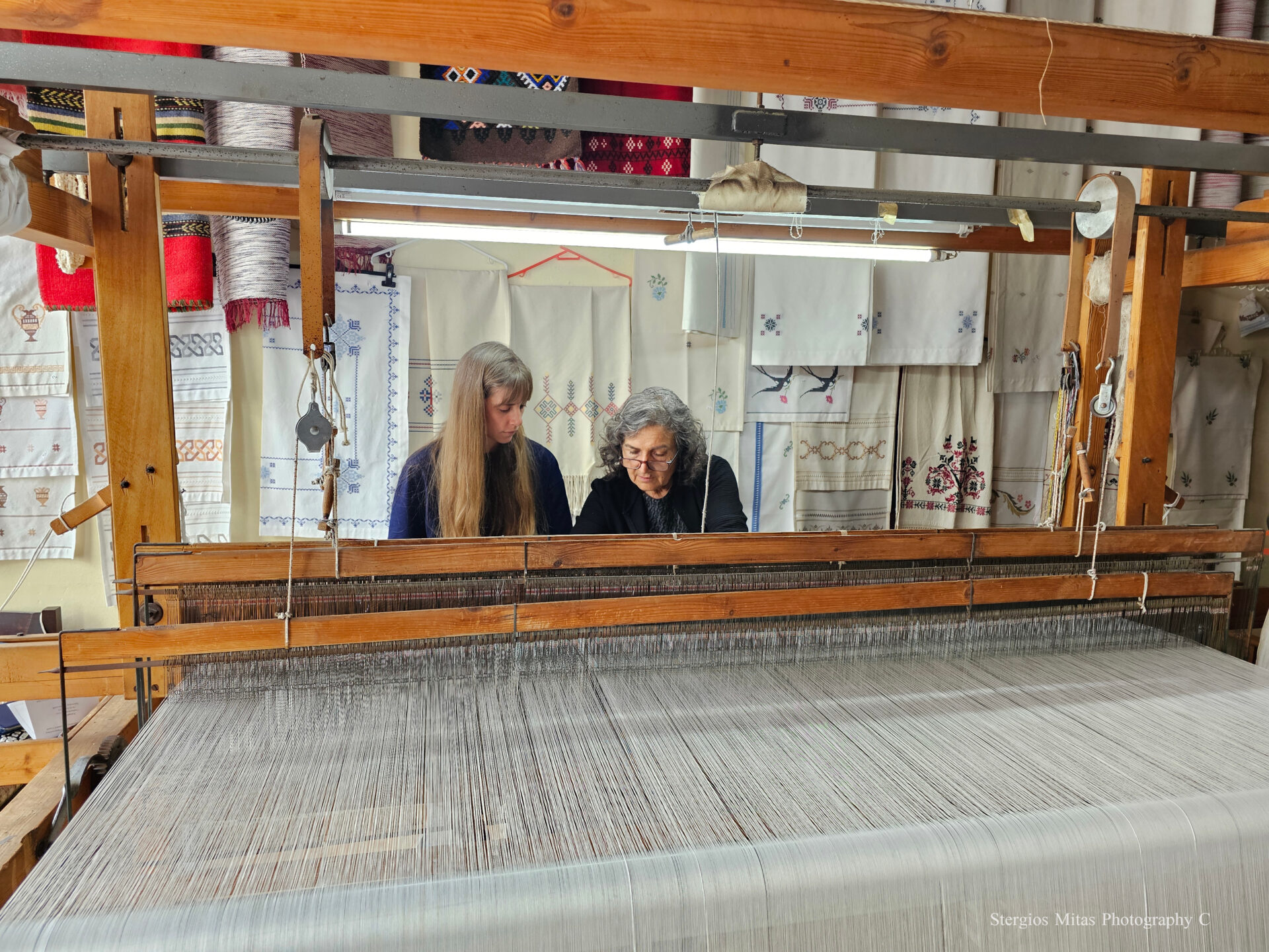 Στην επιστροφή μας το απόγευμα περάσαμε από το χωριό Ζαρός και σταματήσαμε στο παραδοσιακό εργαστήρι υφαντών ‘ Mitos ‘ της κ Μαρίας Ζαχαριουδάκη. Γλυκύτατη η κ Μαρία μας εξήγησε πώς από μια κλωστή, θα κάνεις ένα υφαντό με τον ξύλινο χειροκίνητο αργαλειό. Δεν είναι καθόλου εύκολο. Η Αρετή ήθελε τόσο πολύ να μάθει που δεν ξεκολλούσε από τον αργαλειό, με την κ Μαρία δίπλα της να της περιγράφει όλες τις λεπτομέρειες της τέχνης της. Η τέχνη αυτή μεταφερόταν παλιά από την μαμά στην κόρη και έτσι παρέμενε ζωντανή.