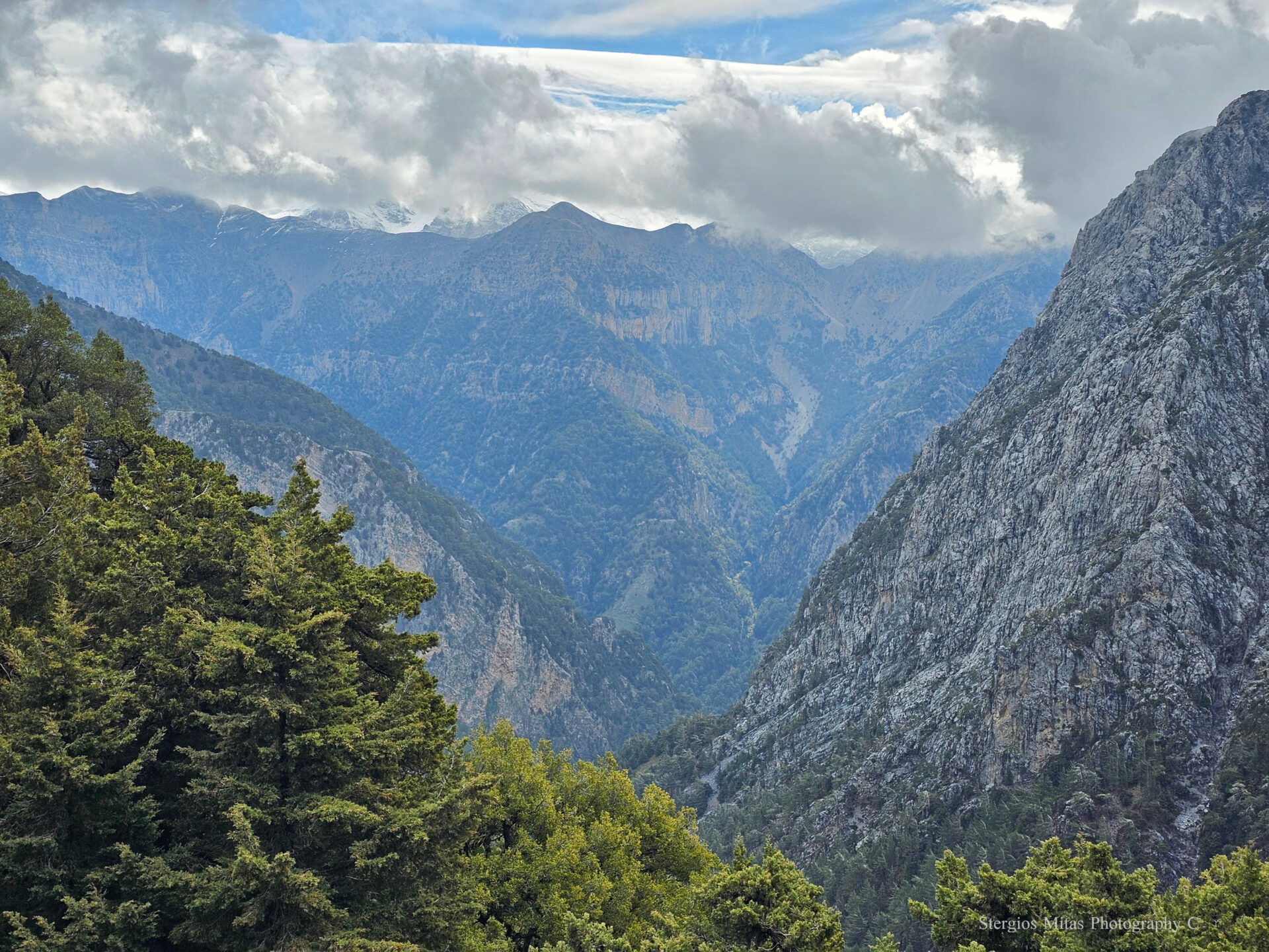 Έχει μήκος περίπου 13 χιλιόμετρα, θέλει πέντε με επτά ώρες πορεία και βγαίνεις στην θάλασσα κοντά στην Αγία Ρουμέλη. Μέσα στο φαράγγι είναι και το χωριό Σαμαριά εγκαταλελειμμένο από το 1962 όταν η περιοχή έγινε εθνικός δρυμός. Το φαράγγι έχει εισιτήριο και πόρτες εισόδου για να μπεις και ανοίγει από Μάιο μέχρι Οκτώβριο. Όταν πήγαμε ήταν κλειστό έτσι κάναμε μια ανάβαση στα Λευκά Όρη με θέα στο φαράγγι. Ο καιρός ήταν άστατος με βροχή και ήλιο, έδινε όμως πολύ όμορφες εικόνες με έναν εκπληκτικό συνδυασμό από σύννεφα, γαλάζιο ουρανό και ήλιο.