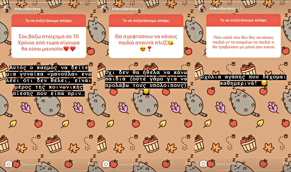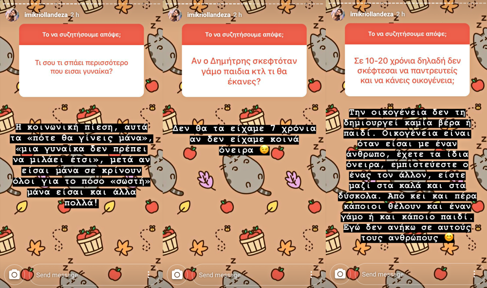 Ένα βράδυ, πριν κοιμηθώ χάζευα στο instagram, και έτυχε να κάνει Q&A η γνωστή youtuber “Μικρή Ολλανδέζα” ή Δανάη Γεωργαντά. Οι ερωτήσεις που τις έκαναν οι θαυμαστές της είχαν να κάνουν με τα τατουάζ της, το κανάλι της, τα σχέδιά της για το μέλλον, τη σχέση της με το αγόρι της με τον οποίο έχουν μαζί το κανάλι, τις διατροφικές της συνήθειες κλπ. Μία ερώτηση όμως ήταν που με ενόχλησε. Και ενόχλησε και την ίδια.