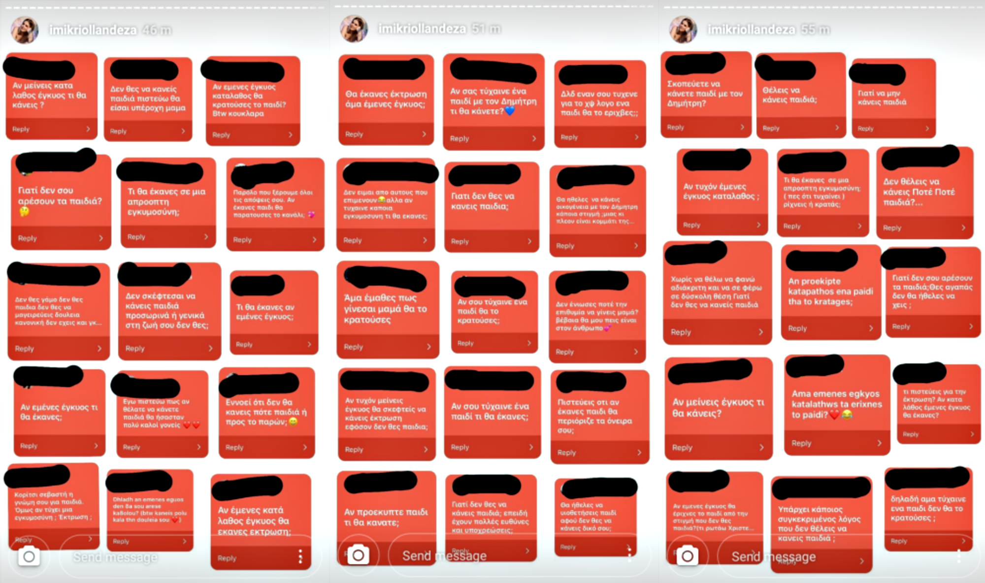 Φυσικά, αναπόφευκτες είναι και οι ερωτήσεις περί εκτρώσεων για ένα φανταστικό, υποθετικό σενάριο που έμενε έγκυος “κατά λάθος”, λες και η εγκυμοσύνη είναι παραπάτημα στο πεζοδρόμιο και συμβαίνει κατά λάθος. Κάθε γυναίκα μπορεί να ελέγξει το σώμα της και τη σεξουαλική της ζωή όπως αυτή κρίνει. Και το εάν θα προχωρούσε σε έκτρωση ή όχι είναι μία ερώτηση που οι περισσότερες γυναίκες δεν απαντάνε με ένα ναι ή όχι, και εκτός αυτού είναι από τις πιο προσωπικές και δύσκολες αποφάσεις που ενδεχομένως θα χρειαστεί να πάρει στη ζωή της. Δε μπορεί να απαντηθεί με ένα story, ούτε έξω από το χορό.
