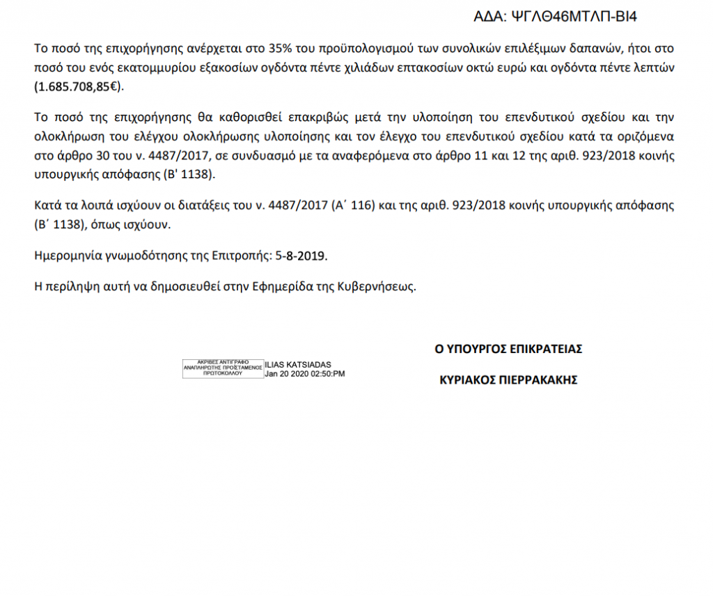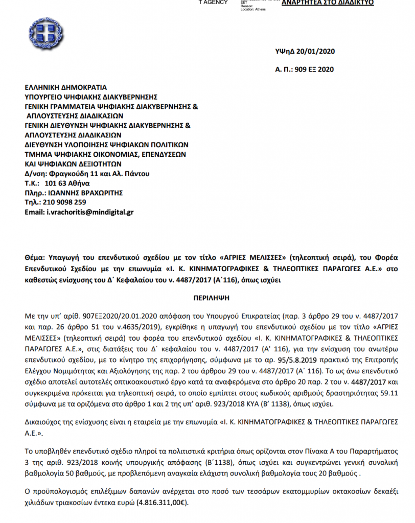 Ο κύριος Πιερακάκης υπέγραψε στις 20/1/2020 μια απόφαση που βασίστηκε σε μια γνωμοδότηση η οποία εδόθη μόλις ένα μήνα μετά τις εκλογές, στις 5/8/2019 για επιδότηση της σειράς Άγριες Μέλισσες, παραγωγή ΑΝΤ1, με το ποσό του 1685000 ευρώ.