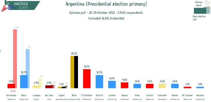 - Στις προκριματικές (PASO) και εν συνεχεία γενικές εκλογές στην Αργεντινή, όπου θα κριθεί το μέλλον του νυν περονιστή προέδρου Αλμπέρτο Φερνάντεθ. Εκ πρώτης όψεως πάντως, η κυβέρνηση που με μεγάλες προσδοκίες αντικατέστησε εκείνη του Μαουρίσιο Μάκρι το 2019 εισπράττει ευρεία λαϊκή δυσαρέσκεια, η οποία βρίσκει ευήκοα ώτα κυρίως στην νεοφιλελεύθερη δημοφιλή πολιτικό Χαβιέρ Μιλέι: