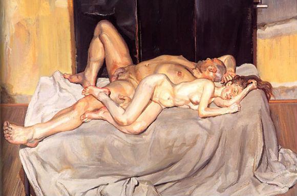 Κι ύστερα τα αναγνωρίσιμα πρόσωπα και μη, ένα πορτραίτο του Francis Bacon (που τόσο πολύ τον επηρέασε), του επίσης εικαστικού John Minton, της Suzy Boyt, της Caroline Blackwood δεύτερης γυναίκας του. Ανάμεσα σ’ αυτά οι αυτοπροσωπογραφίες του, που μάλλον είναι και τα πιο συγκλονιστικά έργα του, «Man’s Head» του 1963, «Reflection with Two Children» του 1965 ιδωμένος από κάτω, «Interior with plant, Reflection listening» του 1968, «Reflection» του 1985 η συγκλονιστική αυτοπροσωπογραφία η οποία αποτελεί και το εξώφυλλο του μικρού καταλόγου της έκθεσης, «Painter Working, reflection» του 1993, ο καλλιτέχνης γυμνός με το πινέλο και την παλέτα στο χέρια. Ύστερα έρχονται τα γυμνά που αμέσως αντιλαμβάνεσαι πως ο Φρόιντ δεν τυποποιούσε και δεν εξιδανίκευε απολύτως τίποτα. Ένα γυμνό κορίτσι μ’ ένα αβγό, ένας γυμνός άνδρας μ’ έναν αρουραίο στο χέρι, τεράστιες χοντρές γυναίκες ξαπλωμένες ανορθόδοξα, με μια δική τους προοπτική, στάσεις συχνά ηθελημένα αμήχανες, πρόσωπα που κάθονται με τα πόδια ανοιχτά, με τα γεννητικά τους όργανα εκτεθειμένα έτσι ώστε, κάθε άλλο παρά ερωτισμό να αποπνέουν.