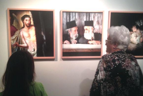 Ένα κορίτσι με τη γιαγιά του στέκονται σιωπηλά μπροστά στην εικόνα δυο ηλικιωμένων καλόγερων. Για διαφορετικούς λόγους η εικόνα προκαλεί δέος και στις δύο. Κρυφακούω. Μοιάζουν με αγίους, λέει το κορίτσι. Σαν του βιβλίου των Θρησκευτικών. Λίγο πιο κει μια πιατέλα με ψάρια. Θυμίζει ευαγγέλιο. Κι αφού πρόσταξε τον κόσμο να καθίσει για φαγητό πάνω στο χορτάρι, πήρε τα πέντε ψωμιά και τα δύο ψάρια, έστρεψε το βλέμμα του στον ουρανό, τα ευλόγησε, έκοψε τα ψωμιά σε κομμάτια και τα έδωσε στους μαθητές κι οι μαθητές στο πλήθος. Έφαγαν όλοι και χόρτασαν. Η πιατέλα έχει τα ψάρια γεωμετρικά βαλμένα σε μια αρμονία. Διπλα η ίδια γεωμετρική τελειότητα στα στρωμένα αγιορίτικα τραπέζια, τραβηγμένα από ψηλά. Σαν πίνακας ζωγραφικής. Πολλές από τις εικόνες του Στράτου Καλαφάτη μοιάζουν σε αυτή την έκθεση με πίνακες. Και πολλές από τις εικόνες του βγαλμένες θαρρείς από τις παράβολες.