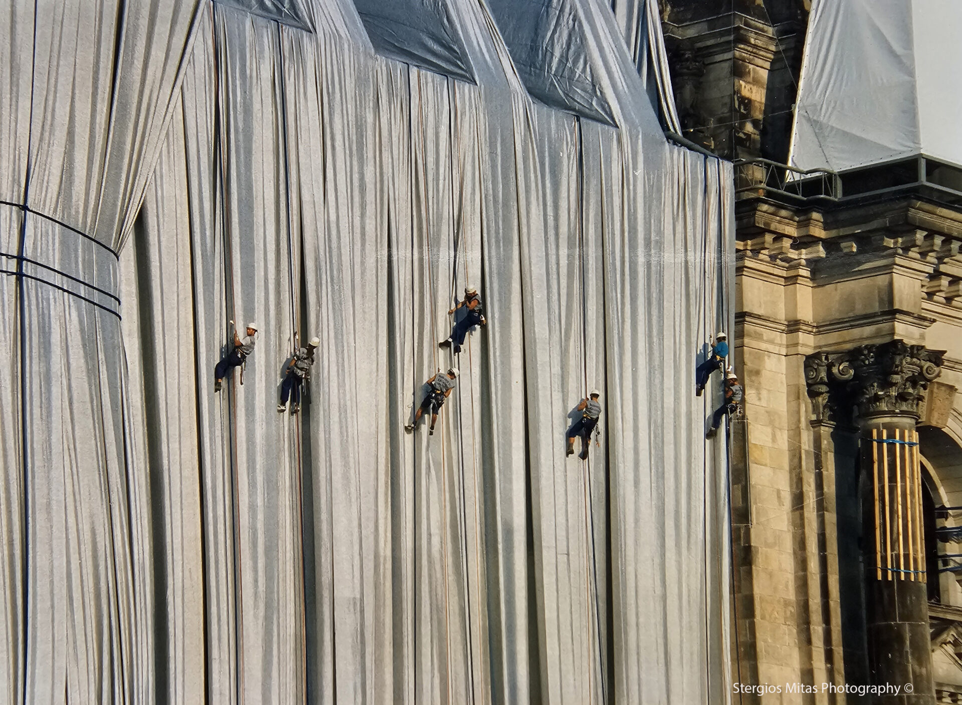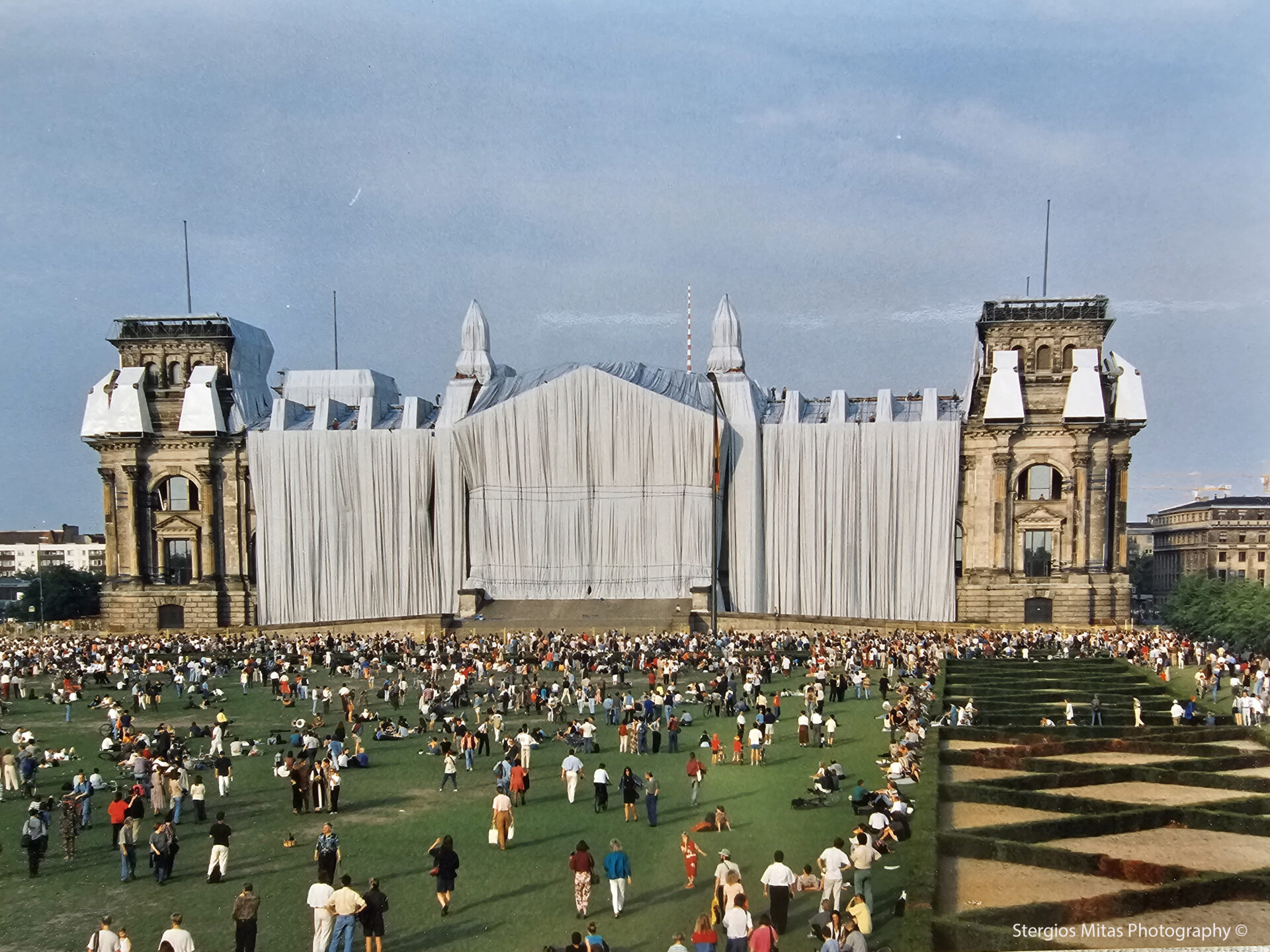 Ήταν καλοκαίρι του 1995 και τελείωνα ένα τμήμα από την εξειδίκευση μου στο Βερολίνο. Οι φωτογραφίες που βλέπεις είναι από το αρχείο μου. Είναι το Reichstag καλυμμένο με άσπρο πανί. Ήταν η εποχή που η Γερμανική κυβέρνηση αποφάσισε να μεταφέρει την έδρα του κοινοβουλίου της από την Βόννη στο Βερολίνο. Το Reichstag είχε μια βαριά μνήμη, έτσι ανέθεσαν στον καλλιτέχνη Christo να το σκεπάσει με λευκό πανί σε μια συμβολική χειρονομία ότι το παλιό φεύγει και το νέο Reichstag έρχεται λευκό από μνήμη.