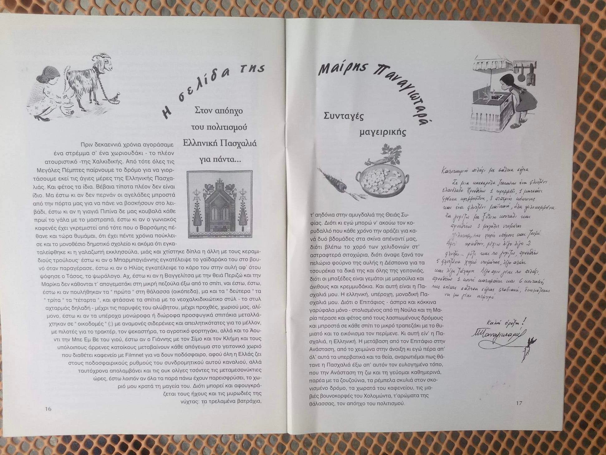 Έστω λοιπόν αν όλα τα παρά πάνω έχουν παρεισφρήσει, το χωριό μου κρατά τη μαγεία του. Διότι μπορεί και αφουγκράζεται τους ήχους και τις μυρωδιές της νύχτας: τα τρελαμένα φεγγάρια, τ’αηδόνια στην αμυγδαλιά της Θείας Σοφίας. Διότι κι εγώ μπορώ ν’ακούω τον Κορυδαλλό που κάθε χρόνο την αράζει κανά δύο βδομάδες στα σκίνα απέναντί μας, διότι βλέπω το χορό των χελιδονιών στ’ αστραφτερά σιτοχώρια, διότι άναψε ξανά των πελώριο φούρνο της αυλής η Δέσποινα για τα τσουρέκια τα δικά της και όλης της γειτονιάς. Διότι οι μπαξέδες είναι γεμάτοι με μαρούλια και ανθούς και κρεμμυδάκια.