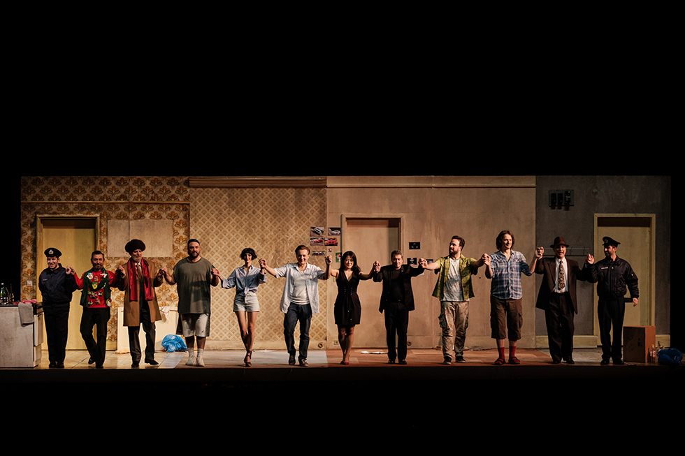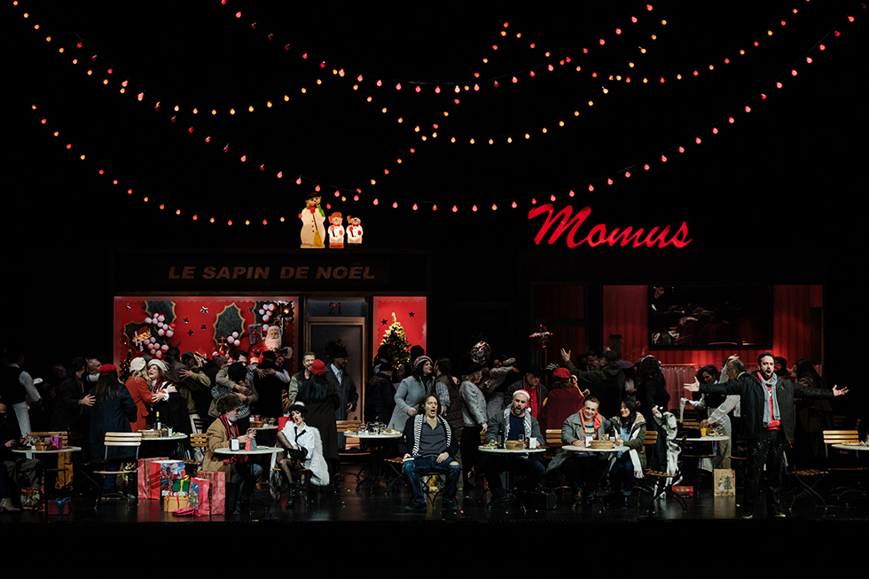 Η έπαρση της αυλαίας ευθύς φανέρωσε τα, γνωστά στο οπερόφιλο αθηναϊκό κοινό, σκηνικά τού διάσημου Βρετανού σκηνοθέτη, σε αναβίωση της Κατερίνας Πετσατώδη, που τοποθετούν την εναρκτήρια πράξη σ’ ένα σύγχρονο τσαντίρι, που καθόλου δεν συναρπάζει για την πρωτοτυπία, τη σύνθεση χρωμάτων ή κάποιον έστω μποέμικο αέρα. Αυτά που εντυπωσίασαν, εντούτοις, ήταν τα υπέροχα χάλκινα -κυρίως τα κόρνα- της Ορχήστρας, αλλά και ο εξόχως γλαφυρός διάλογος των φίλων που προηγήθηκε, με τον Δημήτρη Τηλιακό να ενσαρκώνει πειστικά τον χαρακτήρα τού ζωγράφου Μαρτσέλλο.