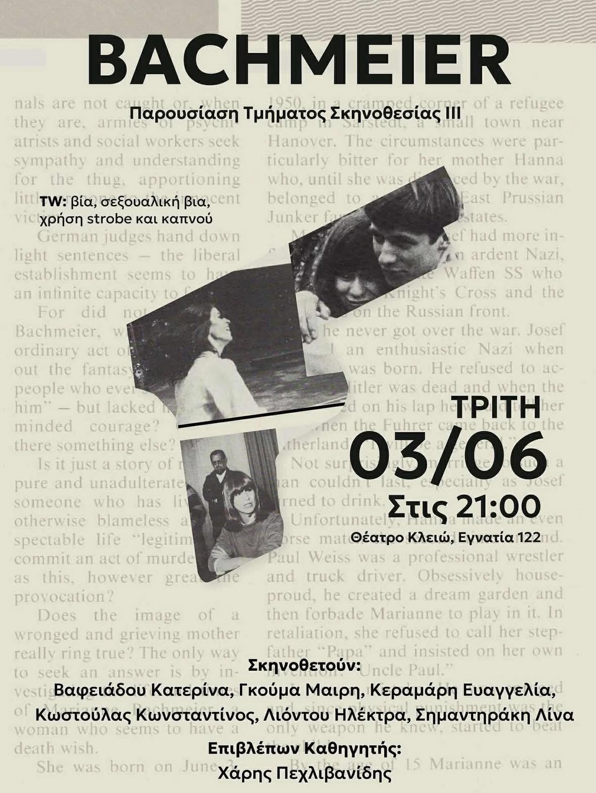 Ο Χάρης Πεχλιβανίδης γράφει για την υπόθεση αυτοδικίας της Μπαχμάιερ που απασχόλησε τους σπουδαστές του μαθήματος «Σκηνοθεσία 3» του Τμήματος Θεάτρου του ΑΠΘ