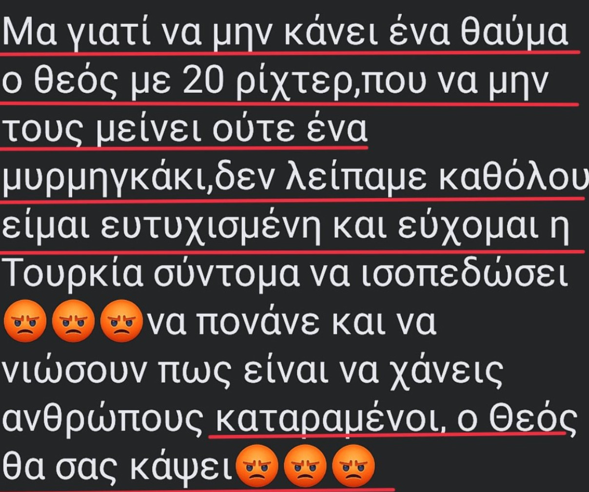 Για μερικά δευτερόλεπτα βάλε τον εαυτό σου απέναντι στα συντρίμμια της ζωής σου, έχοντας χάσει τους αγαπημένους σου και ζώντας με την αγωνία του τι θα συμβεί αύριο που δεν έχεις ένα σπίτι να μείνεις. Βάλε τον εαυτό σου ως επιζών ενός τέτοιου φονικού σεισμού, με την σκόνη από τα μπάζα σε όλο σου το σώμα, πληγές παντού, τριγύρω αίμα και πανικός και πες μου αν ακόμη σου βγαίνει αυτό το μίσος που απλώνεις πίσω από τo πληκτρολόγιο.