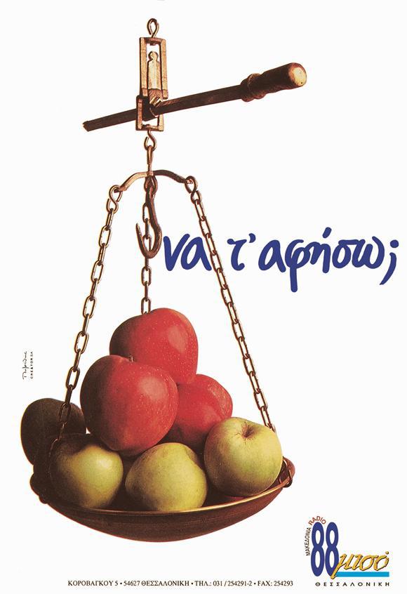 Θυμάμαι λοιπόν το τοπίο της διαφήμισης – επικοινωνίας της εποχής και τα μέσα που υπήρχαν στη διάθεσή μας: η πόλη τότε ήταν γεμάτη με γιγαντοαφίσες που τις λέγαμε 12φυλλες, γιατί αποτελούνταν από δώδεκα αφίσες 70χ100εκ. που δημιουργούσαν μία ενιαία εικόνα. Αργότερα τετραπλασιάστηκαν σε μέγεθος και τις βαφτίσαμε 48φυλλες… Όλες μαζί δημιουργούσαν μία απίστευτη οπτική ρύπανση γιατί οι περισσότερες ήταν αισθητικά άθλιες. Σαν όαση ανάμεσά τους ξεχώριζαν οι αφίσες του Oliviero Toscani για την Benetton.