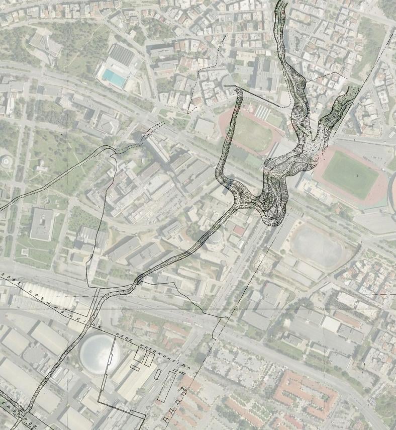 Εικόνα 2. Ο χείμαρρος των Νεκροταφείων στο ρυμοτομικό του 1919, προσαρμοσμένος επάνω σε σύγχρονη δορυφορική εικόνα από τον Leo Dri (Μπλιώνης & Τρεμόπουλος, σελ. 173).