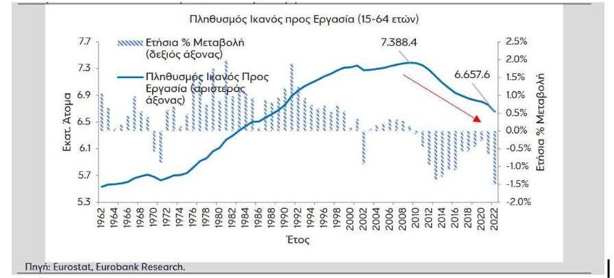 Τέλος, σε ό,τι αφορά τον πληθυσμό ικανό προς εργασία (ηλικιακή ομάδα 15-64 ετών), από τα 7,4 εκατ. το 2009 μειώθηκε στα 6,7 εκατ. το 2022.