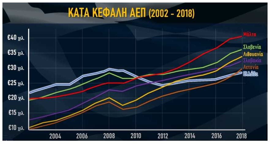 Για την απάντηση της εν λόγω ερώτησης αναπόφευκτα οδηγούμαστε σε μία κατά ανάγκη σύγκριση με χώρες όπως η Σλοβενία, η Λιθουανία, η Σλοβακία, η Λετονία και η Μάλτα που όλες τους μία δεκαετία νωρίτερα ήταν φτωχότερες από εμάς και σήμερα όπως φαίνεται και από το διάγραμμα μας έχουν ξεπεράσει.