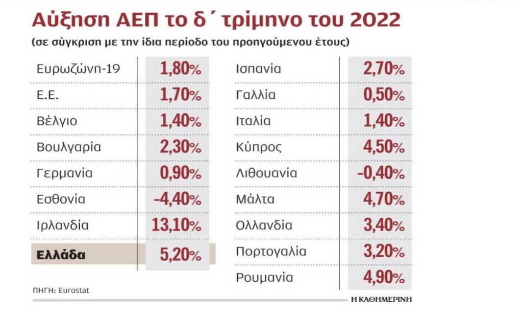 Ωστόσο με γιγαντιαίους τίτλους το σύνολο σχεδόν των Ελληνικών μέσων μαζικής ενημέρωσης θριαμβολογούν για το δεύτερο υψηλότερο ρυθμό ανάπτυξης στην Ευρώπη, παρουσιάζοντας αύξηση του ΑΕΠ το δ΄τρίμηνο του 2022 στο 5,2% για την Ελλάδα.
