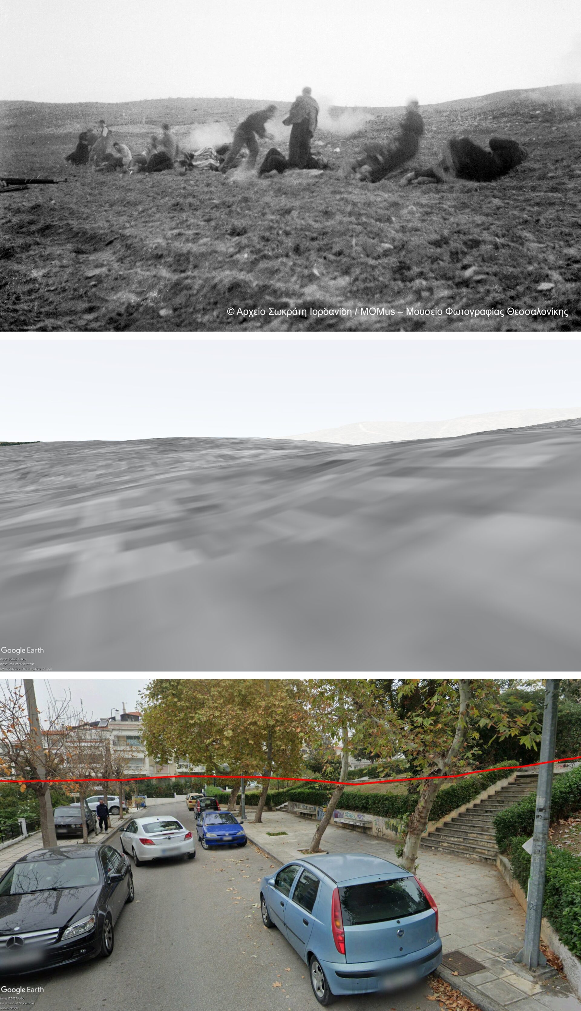 Η μελέτη μιας σειράς από φωτογραφικές λήψεις του Σωκράτη Ιορδανίδη (Μουσείο Φωτογραφίας Θεσσαλονίκης), που απεικονίζουν εκτελέσεις καταδικασμένων πίσω από το Επταπύργιο, οδήγησε στην ταύτιση των επεισοδίων και του χώρου. Οι φωτογραφίες, που χρονολογούνται με ακρίβεια στις 17 και 23 Οκτώβριου 1947, απεικονίζουν δύο διαφορετικές εκτελέσεις που πραγματοποιήθηκαν ακριβώς στον χώρο του σημερινού Πάρκου, πολύ κοντά στο σημείο όπου εντοπίστηκαν πρόσφατα οι σκελετοί (Εικόνα 1).