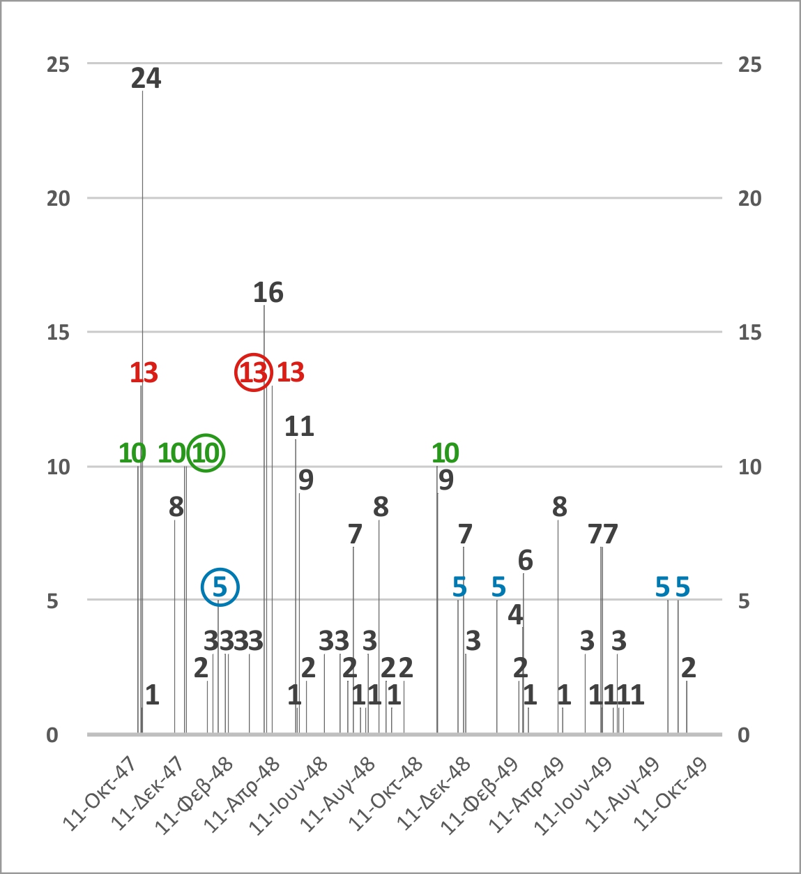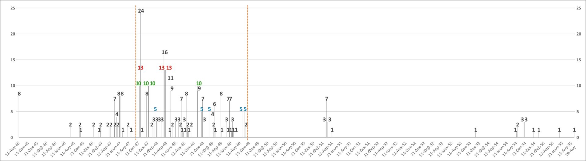 Μετατρέποντας τα δεδομένα του Πίνακα 1 σε γράφημα (Γράφημα 1 & 2: οριζόντιος άξονας ημερομηνίες – κάθετος άξονας πλήθος εκτελεσμένων) γίνονται και οπτικά αντιληπτά τα συγκεκριμένα 12 επεισόδια που προτείνουμε ότι μπορεί να ταυτίζονται με τις τρεις εν λόγω συγκεντρώσεις (κόκκινο ΟΤ-13, πράσινο ΟΤ-10, μπλε ΟΤ-5).