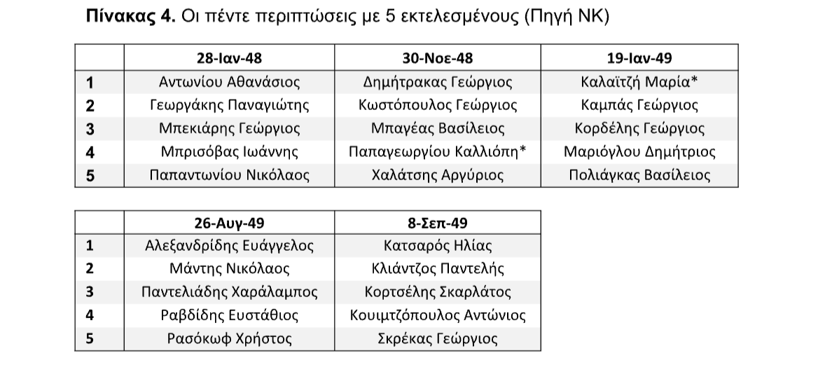 Πίνακας 5. Εκτελεσμένες στον χώρο «πίσω από το Επταπύργιο» (ΕΑ: 27, Πηγή ΝΚ)