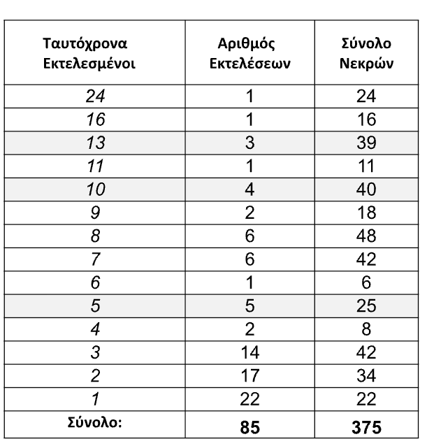 Με αυτόν τον τρόπο, και με βάση τον ΝΚ, προέκυψε ένας ελάχιστος αριθμός 85 επεισοδίων-εκτελέσεων, που στη συνέχεια κατηγοριοποιήθηκαν βάσει του πλήθους των εκτελεσμένων.