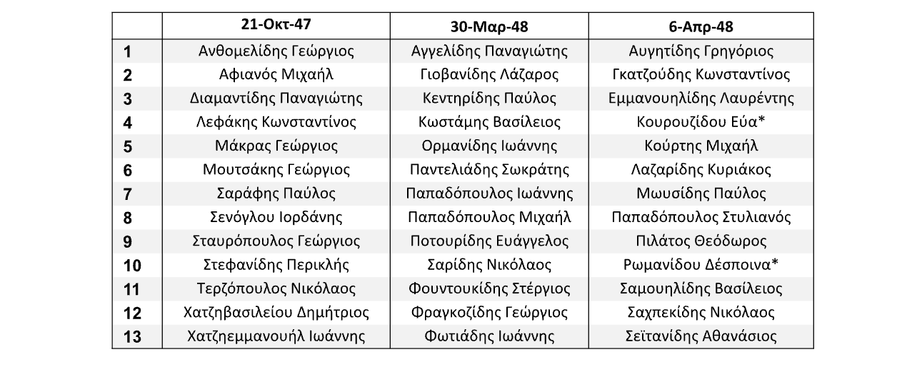Χρησιμοποιήθηκαν τρεις κατηγορίες στοιχείων: τα ονοματεπώνυμα, το φύλο και η ημερομηνία εκτέλεσης. Η αντιπαραβολή, αλληλοσυμπλήρωση και επακόλουθη διόρθωση των τριών συνόλων οδήγησε στη δημιουργία ενός Νέου Καταλόγου (στο εξής ΝΚ), που περιέχει 375 ονόματα (348 άνδρες, 27 γυναίκες), που εκτελέστηκαν στο διάστημα 1945-1955. Ο αριθμός αυτός, αν και πιθανότατα αντιστοιχεί σε υποσύνολο του πραγματικού συνόλου, αποτελεί έναν αξιόπιστο Ελάχιστο Αριθμό (στο εξής ΕΑ) εκτελεσμένων της περιόδου, καθώς το 94% των ονομάτων έχει, με τον έναν ή άλλο τρόπο, διασταυρωθεί.