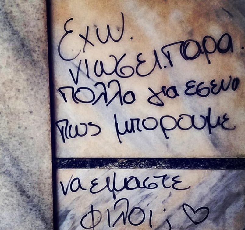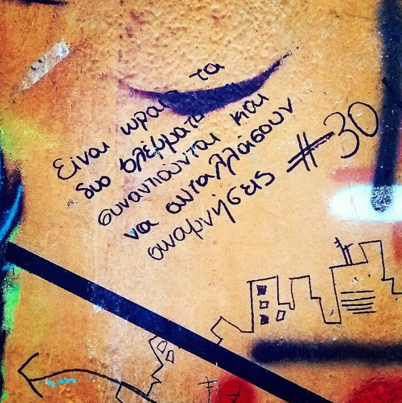 Κάποιοι τοίχοι αφηγούνται συναισθήματα. Αυτούς ν’ ακούς. Και πού ξέρεις; ίσως για ένα δέκατο του δευτερολέπτου κάποιος ψίθυρος να ξυπνήσει και τη δική σου εφηβική ορμή. Ίσως τότε να θυμηθείς για λίγο πώς είναι να είσαι ερωτευμένος με τα πάντα προτού βρίσεις τον ανεγκέφαλο που βρόμισε έναν ακόμη τοίχο.