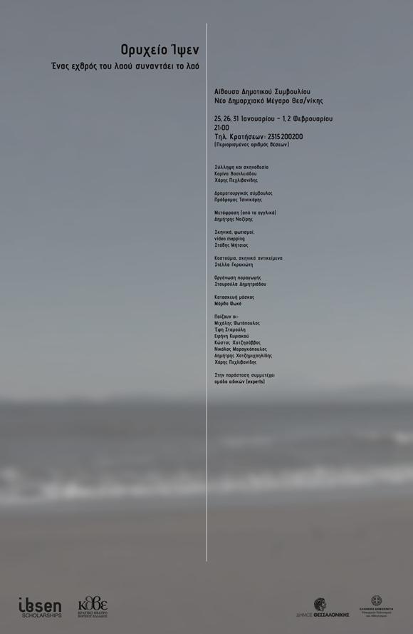*Η παράσταση γίνεται υπό την αιγίδα των Ibsen Schollarships του Υπουργείου Πολιτισμού της Νορβηγίας, σε συμπαραγωγή του ΚΘΒΕ και την αιγίδα της Αντιδημαρχίας Πολιτισμού του Δήμου Θεσσαλονίκης.