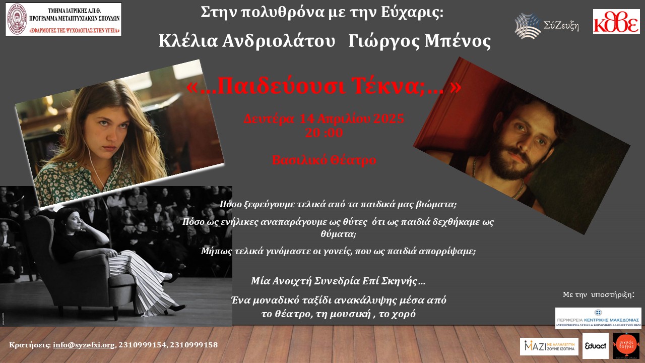 Η Πολιτιστική Ψυχοθεραπεία με τίτλο «Παιδεύουσι Τέκνα» που θα παρουσιαστεί στις 14 Απριλίου, στο Βασιλικό Θέατρο στις 20:00, είναι η δεύτερη στην Ελλάδα, μετά τα «Συγνώμη των Γονιών» που παρουσιάστηκε στην Αθήνα τον Ιανουάριο του 2025.