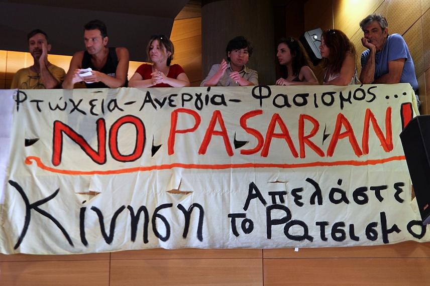 “Oι κύριοι από δω κι από κει…” ξεκίνησε να λέει ο Γιάννης Μπουτάρης μόλις ανέβηκε στο βήμα για να αναγγείλει την ορκωμοσία της νέας δημοτικής αρχής. Οι κύριοι στους οποίους αναφερόταν ήταν μέλη της ΚΕΕΡΦΑ ((Κίνηση Ενωμένοι Ενάντια στο Ρατσισμό και τη Φασιστική Απειλή) και υποστηρικτών της Χρυσής Αυγής τα οποία έχοντας καταλάβει τους δυο εξώστες της αίθουσας του δημοτικού συμβουλίου εκτόξευαν συνθήματα μετατρέποντας την αίθουσα σε γήπεδο εν ώρα ντέρμπι. Όταν οι Χρυσαυγίτες φώναζαν: «όχι φυλακές για τους εθνικιστές», οι αντιφασίστες απαντούσαν «ούτε στα συμβούλια, ούτε πουθενά, τσακίστε τους φασίστες σε κάθε γειτονιά» και ο “Παύλος ζει, τσακίστε τους ναζί.