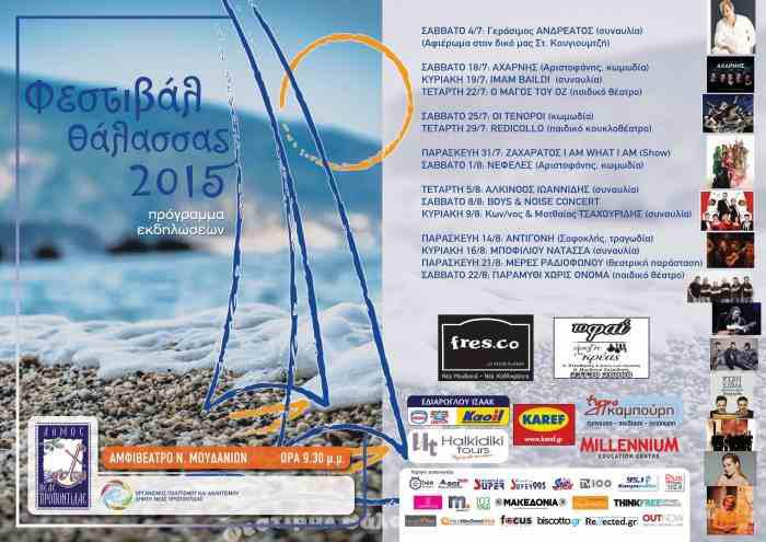 Το Σάββατο 4 Ιουλίου ανοίγει η αυλαία των εκδηλώσεων του Φεστιβάλ της Θάλασσας με τη συναυλία του Γεράσιμου Ανδρεάτου, αφιέρωμα στον Στ. Κουγιουμτζή.Το φετινό Φεστιβάλ φιλοξενεί θεατρικές και μουσικές παραστάσεις που παρουσιάζονται ανά την Ελλάδα. Πρώτη θεατρική παράσταση είναι οι “Αχαρνής” σε σκηνοθεσία Γιάννη Κακλέα και στο ρόλο του Δικαιόπολη ο Βασίλης Χαραλαμπόπουλος (18/7). Την επομένη συναυλία με τους Imam Baildi και ακολουθούν οι θεατρικές παραστάσεις “Οι Τενόροι” του Βλαδίμηρου Κυριακίδη (27/7), “I Am What I Am”, μουσικοθεατρική παράσταση με τον Τάκη Ζαχαράτο (31/7), “Νεφέλες” του Βασίλη Παπαβασιλείου (1/8), “Αντιγόνη” του Θέμη Μουμουλίδη με τον Γιώργο Κιμούλη (14/8), “Μέρες Ραδιοφώνου” του Μάκη Δελαπόρτα (21/8) και “Bam bam” των Ray Cooney και John Chapma, σε σκηνοθεσία Γιώργου Βάλαρη. Οι υπόλοιπες συναυλίες του φεστιβάλ, διάσπαρτες μέσα στους δυο πιο καυτούς καλοκαιρινούς μήνες είναι: Αλκίνοος Ιωαννίδης (5/8), Boys and Noise (8/8), συναυλία με τον Κωνσταντίνο και τον Ματθαίο Τσαχουρίδη (9/8) και Νατάσα Μποφίλιου (16/8).