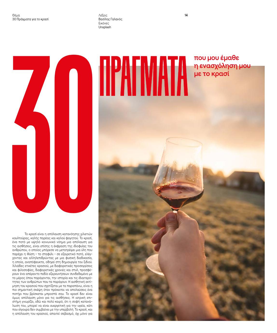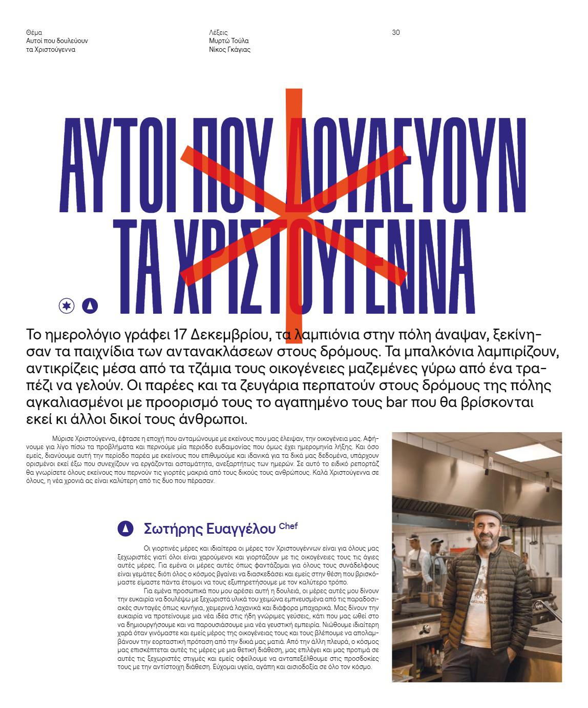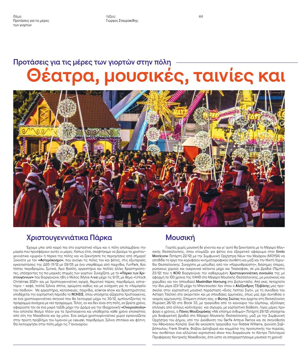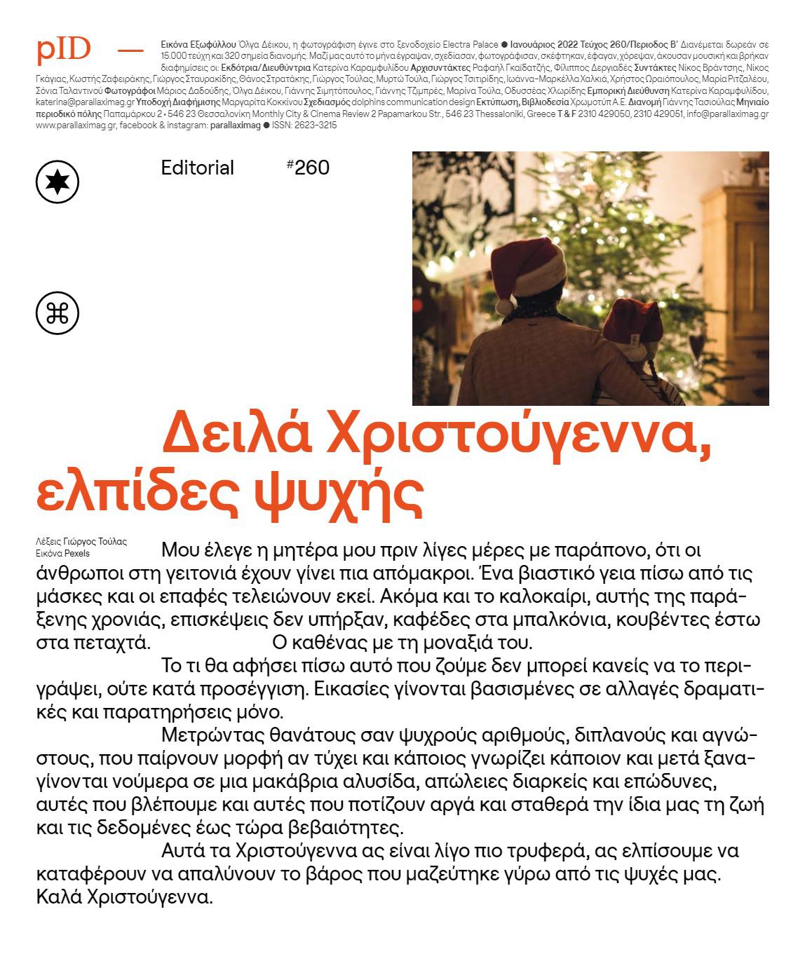 Δειλά Χριστούγεννα, ελπίδες ψυχής. Ο Γιώργος Τούλας γράφει για τα φετινά Χριστούγεννα ευχόμενος να καταφέρουν να απαλύνουν το βάρος που μαζεύτηκε γύρω από τις ψυχές μας. Είναι η Θεσσαλονίκη έτοιμη για Πόλη Γαστρονομίας της Unesco; Η μοναδική ευκαιρία της πόλης να πρωταγωνιστήσει στην παγκόσμια στην παγκόσμια γαστρονομική σκηνή. Ο Βασίλης Γαλανός γράφει για τα 30 πράγματα που το έμαθε η ενασχόληση του με το κρασί. Οίνος – Εμπειρίες μέθεξης. Γύρω από το κρασί υφαίνονται οι καλύτερες ιστορίες και η Σόνια Ταλαντινού μας προτείνει τους καλύτερους για να δημιουργήσουμε τις δικές μας. «Εγώ δεν έγινα σταρ ως δήμαρχος, ήμουν σταρ…» Ο Γιάννης Μπουτάρης σε μια συνέντευξη ζωής στην parallaxi. Μυρτώ Τούλα και Νίκος Γκάγιας μιλούν με εκείνους που περνούν τα Χριστούγεννα με αγνώστους. Ο διακριτικός φωτογράφος ενός αόρατου κόσμου, ο Κωνσταντίνος Τσακαλίδης, αποκαλύπτεται στην parallaxi. Θέατρο, μουσικές, ταινίες, θεματικά πάρκα, εκδηλώσεις – Προτάσεις για τις μέρες των γιορτών στην πόλη. Και ένας απολαυστικός επίλογος – έκπληξη με την υπογραφή του Θανάση Παπακωνσταντίνου.