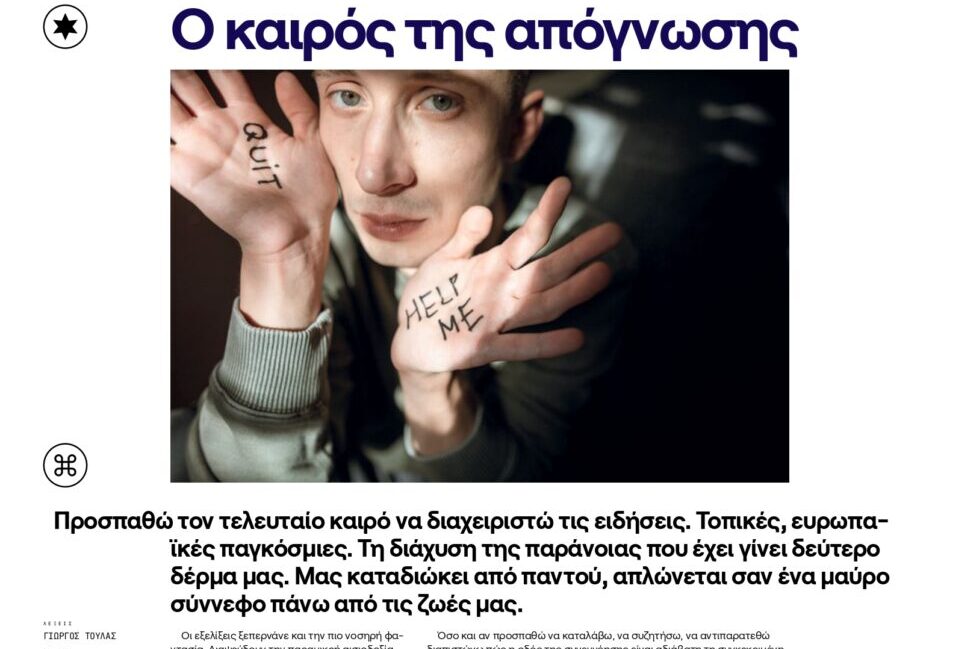 Ο Γιώργος Τούλας γράφει για τη διάχυση της παράνοιας που έχει γίνει δεύτερο δέρμα μας. Μας καταδιώκει από παντού, απλώνεται σαν ένα μαύρο σύννεφο πάνω από τις ζωές μας.