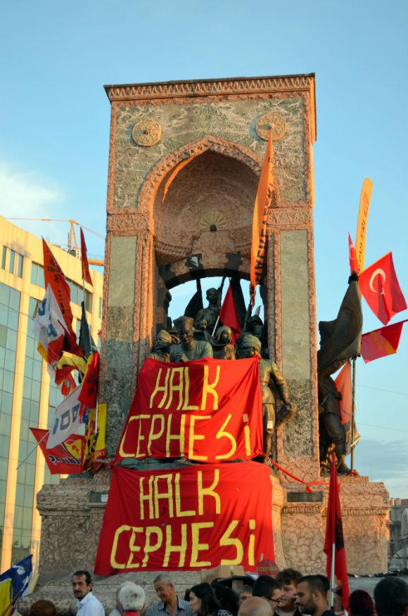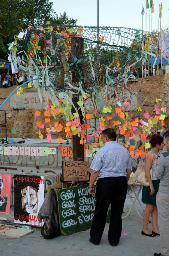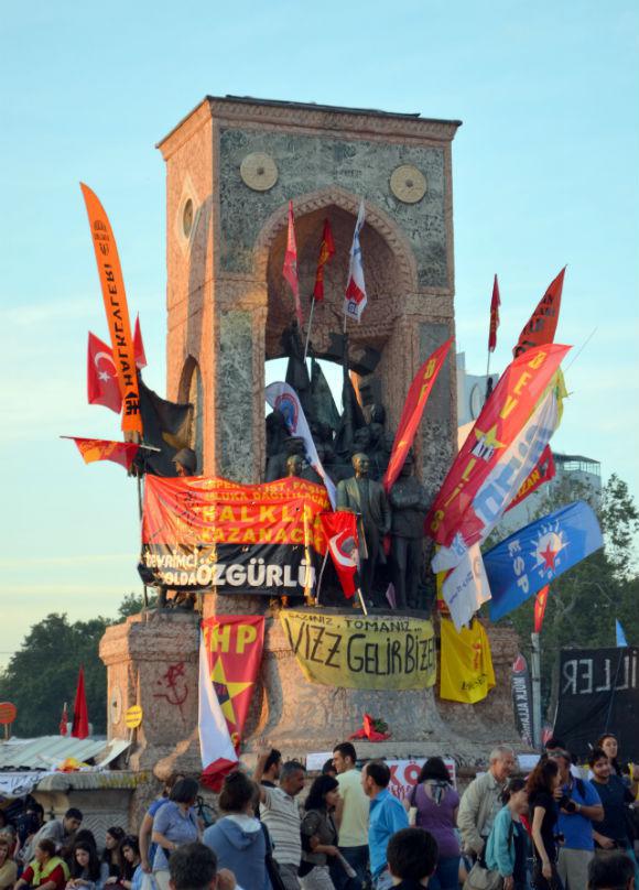 Το γνωστό σε όλους μνημείο στο κέντρο της Ταξίμ αγνώριστο. Σκεπασμένο με σημαίες, πανό και συνθήματα. Στη βάση του δύο – τρία τσαντίρια. Νεαροί και νεαρές μαζεμένοι γύρω τους. Πιο εκεί κάποιοι πιο οργανωμένοι φωνάζουν συνθήματα. Πλήθη παντού. Πολλοί με τα παιδιά τους. Βολτάρουν, φωτογραφίζουν, κουβεντιάζουν, τρώνε, γελάνε, αράζουν στα πεζούλια και στο γρασίδι. Εντυπωσιακό, δεν πατούν τα λουλούδια. Τύμπανα, πνευστά και νταούλια δίνουν τον τόνο στη μουσική υπόκρουση. Κάποιοι χορεύουν κυκλικά πιασμένοι από τους ώμους. Παντού μικροπωλητές κάθε λογής. Αν δεν είναι μια άλλου είδους «επανάσταση» είναι σίγουρα η επανάσταση των μικροπωλητών. Ντόπιων και αλλοδαπών – μέχρι και η Ονδούρα εκπροσωπείται στις τάξεις τους. Που, απαλλαγμένοι από τις απαγορεύσεις της δημοτικής αστυνομίας, άπλωσαν την πραμάτειά τους παντού. Πουλάνε αλύπητα τα πάντα. Σουβλάκια και μπιφτέκια, καρπούζι σε φέτες, καθαρισμένο ανανά, στρείδια, νερά, τσάι, καλαμπόκια, κουκλάκια, μάσκες των anonymous, γυαλιά κολυμβητών για να προστατεύονται τα μάτια σε μια ενδεχόμενη ρίψη δακρυγόνων, μπαλόνια, μαλλί της γριάς, αφίσες του Τσε και του Σαρλώ, φωτογραφίες της παλιάς Istanbul, σημαίες τουρκικές κι άλλες με τον Κεμάλ – αυτοί οι ίδιοι μεθαύριο θα πουλάνε σημαίες με τον Ερντογάν… Αληθινό πανηγύρι. Κακόγουστο πάντως. «Επανάσταση», ακόμη κι εκφυλισμένη, σε καμιά περίπτωση. Από τον τρίτο όροφο ενός γωνιακού ζαχαροπλαστείου έχεις πλήρη εποπτεία των μικρών ομάδων που παρελαύνουν κάθε τόσο με τις σημαίες και τα συνθήματά τους. Αριστεροί με σφυροδρέπανα και εθνικιστές με τον Κεμάλ κατάσαρκα, οπαδοί και χούλιγκαν ποδοσφαιρικών ομάδων με τα αντίστοιχα κασκόλ και καπέλα, ασφαλώς οικολόγοι, τραβεστί και ομοφυλόφιλοι με δική τους σημαία – άλλωστε το επίμαχο πάρκο είναι το στέκι τους-, ακόμη και φεμινίστριες… όλοι βρήκαν την ευκαιρία τους. Στην άκρη της πλατείας μπροστά στο κατειλημμένο από τους υπερασπιστές του πάρκο Γκεζί ακινητοποιημένες και κάποιες με σοβαρές ζημιές οι μπουλντόζες. Την ημέρα που θα δοθεί η εντολή να ξαναρχίσουν τα έργα θα έχουμε στα κανάλια με μεγαλύτερη ένταση τη συνέχεια του έργου «αιματηρές διαδηλώσεις στην Τουρκία».