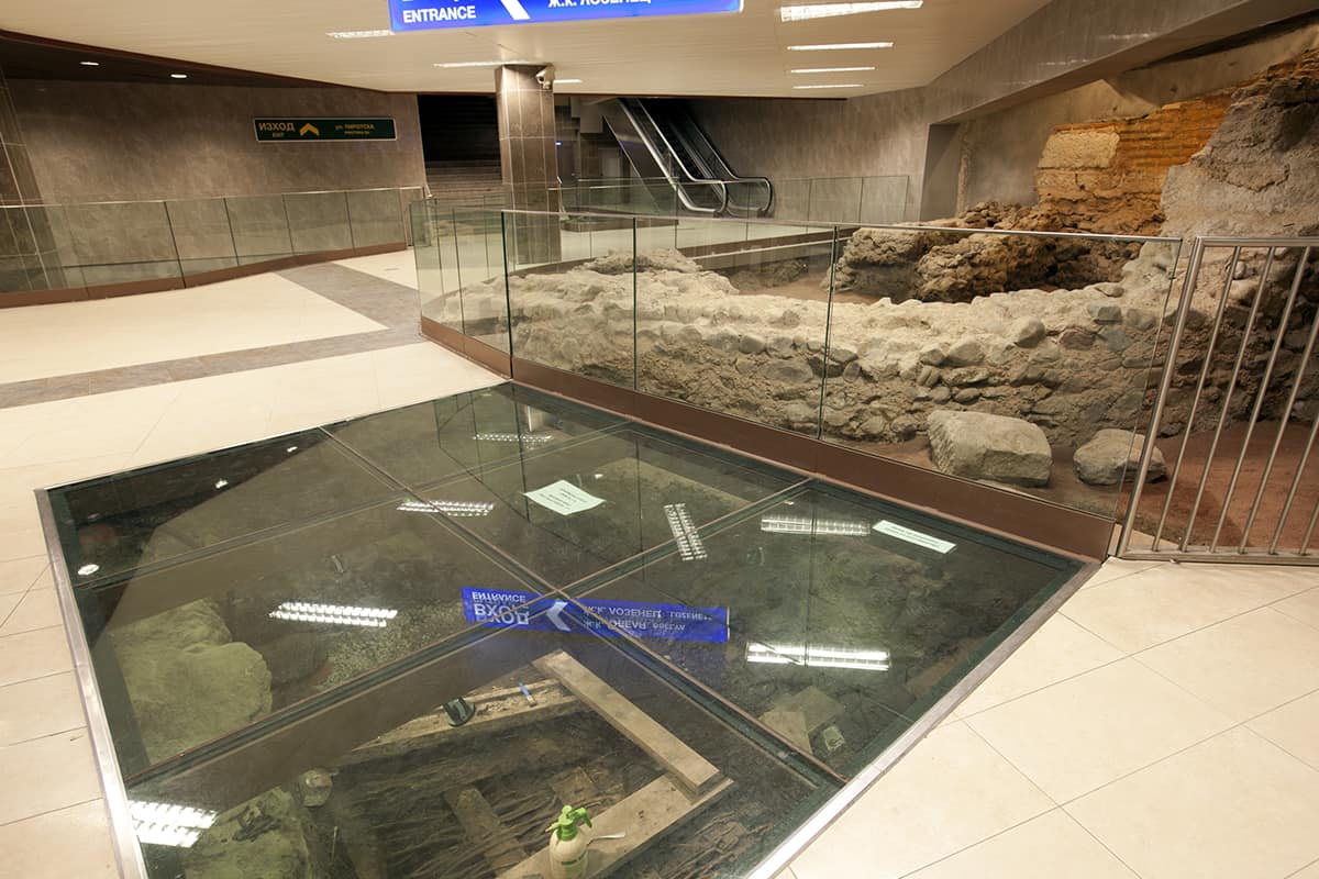 Στο πάνω τμήμα του σταθμού, κάτω από γυάλινους θόλους που λούζουν με φως τις αρχαιότητες απλώνεται ένα σημαντικό κομμάτι του τοπικού Decumanus Maximous, του ρωμαϊκού δρόμου που ένωνε την Ανατολή της Βουλγαρίας με τη Ρώμη.