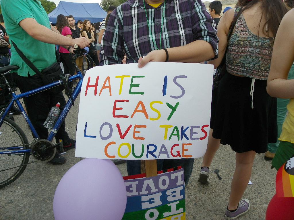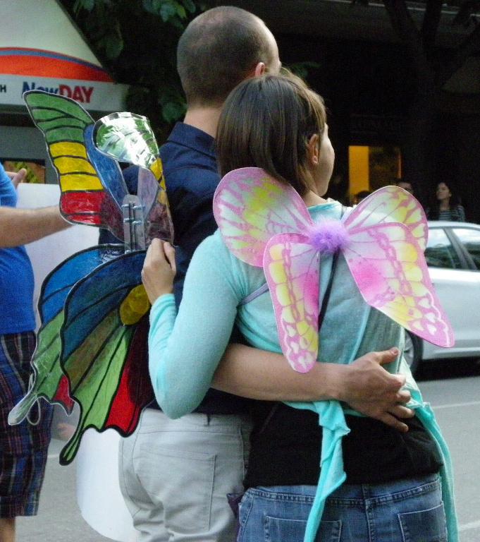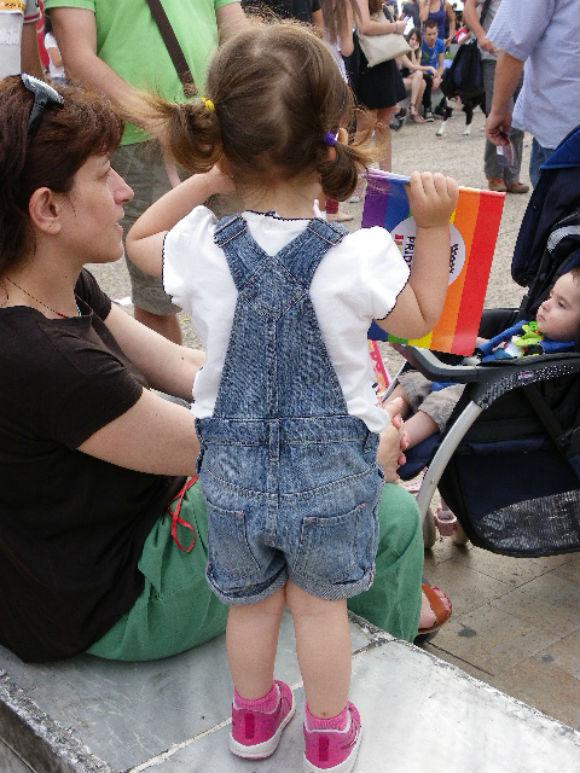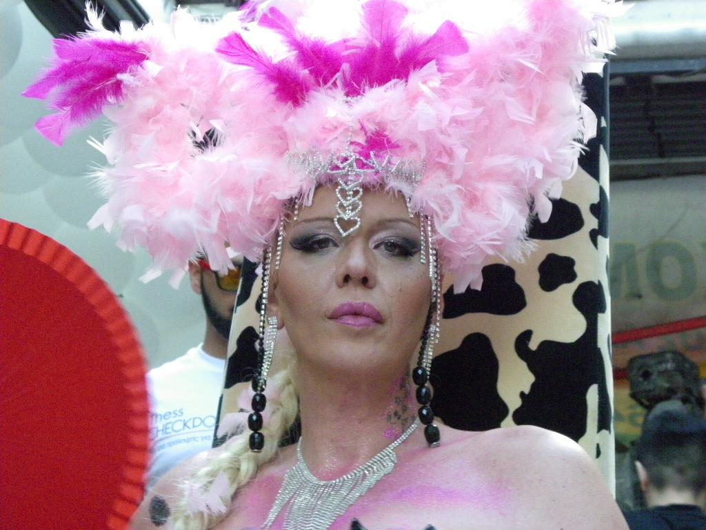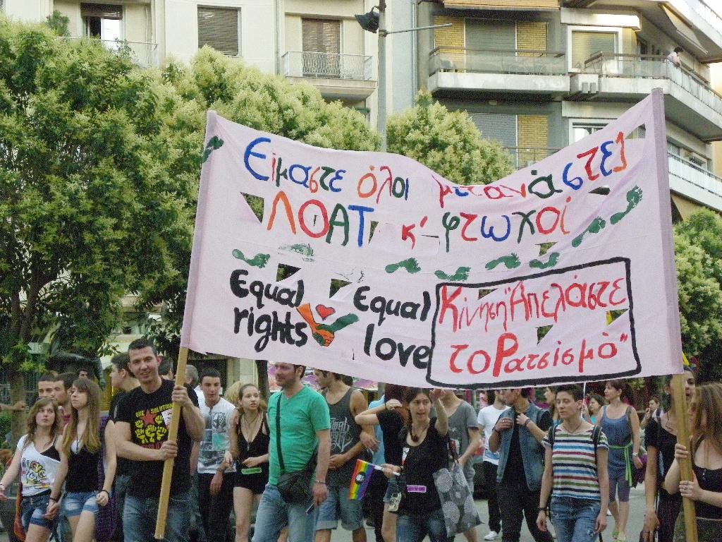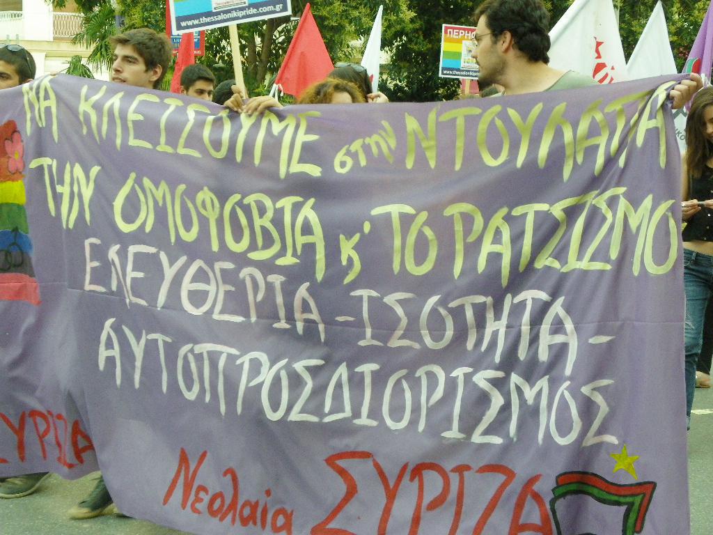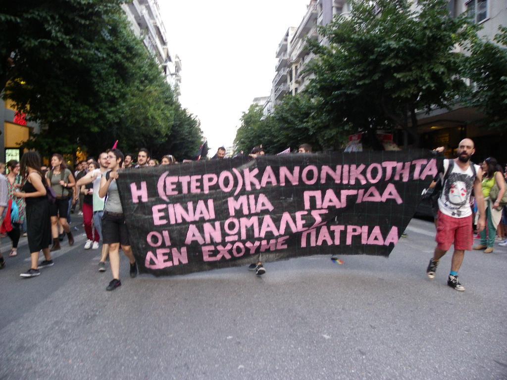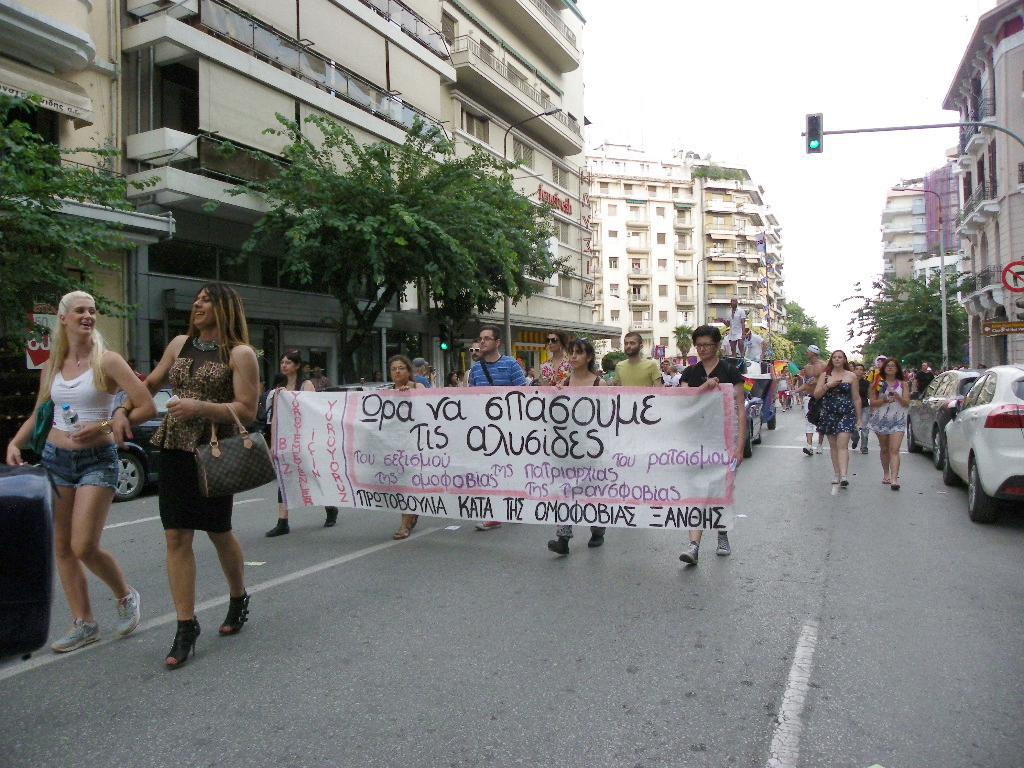 Φωτογράφιζα αριμανίως (ευχαριστώ ΓΒ για τη χορηγία), μιλούσα με φίλες και φίλους, είδα συναδέλφους στην πορεία, τον φίλο μου και εντεταλμένο τουρισμού Σπύρο Πέγκα με χαμόγελο μέχρι τα αυτιά για τους τουρίστες που κατάφερε και φέρει και εδώ, τον αμερικανό πρόξενο αλλά και πολλούς ξένους, την Ελεάνα και τη Ζώγια με τους «σπόρους» τους, τη Νίκη, τον Γιάννη, γονείς που τα παιδιά τους είναι gay και αυτοί συνομήλικοί μου (και το χάρηκα διπλά, που η γενιά μου άρχισε να αλλάζει τα πράγματα), είδα ζευγάρια straight, ζευγάρια gay, η Χ με την Ε, είδα μοναχικούς και πολυγαμικούς, gay, straight, αμφί και τρανσέξουαλ, είδα νέους και όχι τόσο νέους αλλά και ηλικιωμένους από το πεζοδρόμιο να μας χαμογελάνε και να χειροκροτούν, πρόσωπα γελαστά και χαρούμενα, όλοι να φωτογραφίζουν, με τα ποδήλατα (μονά και διπλά), τα παιδιά και τα σκυλιά τους, να χορεύουν, να φιλιούνται… Είδα υπέροχα κοστούμια και άρματα, τη βασίλισσα και τη γοργόνα, αεροσυνοδούς, παπάδες κ.ο.κ. φτιαγμένα με πολλή φαντασία και χιούμορ… Και πολλά νέα κορίτσια και αγόρια που βάδιζαν με χαρά και περήφανα. Από την Αθήνα, την Ξάνθη και φυσικά από τη Θεσσαλονίκη. Είδα παιδιά φίλων, φοιτήτριες και φοιτητές μου, παιδιά άγνωστα που ήθελα όλα να τα αγκαλιάσω και να τους ευχηθώ να έχουν μία καλή ζωή. Παιδιά από πολλούς πολιτικούς χώρους. Με υπέροχα συνθήματα: «καλύτερα μιας ώρας ελεύθερη αδελφή, παρά 40 χρόνια σκλαβιά και κρυφή», ή το θεϊκό: «είμαστε όλοι μετανάστες, ΛΟΑΤ και φτωχοί» ή το: «ούτε ένα βήμα πίσω» και το «ώρα για μας», το κεντρικό σύνθημα της εκδήλωσης υπό την αιγίδα της Πρωτεύουσας Νεολαίας, τυπωμένο σε αφίσες, μπλουζάκια. Η πορεία ήταν μεγάλη, είχε παλμό χάρις στους paranaoue και τα υπέροχα τύμπανά τους, είχε πολύ χορό πάνω στο άρμα (ο Πρόιος μία από τις ψυχές του φεστιβάλ κόντεψε να ξεβιδωθεί…) αλλά και έξω από αυτό, η Φωτεινή κατήντησε ανάπηρη από τον χορό. Είχε συντροφικότητα και χαρά μέσα στις άθλιες μέρες που ζούμε και μας δοκιμάζουν όλους, άλλους περισσότερο, βεβαίως από κάποιους άλλους. Πώς να την αντέξει τέτοια χαρά ο Άνθιμος;
