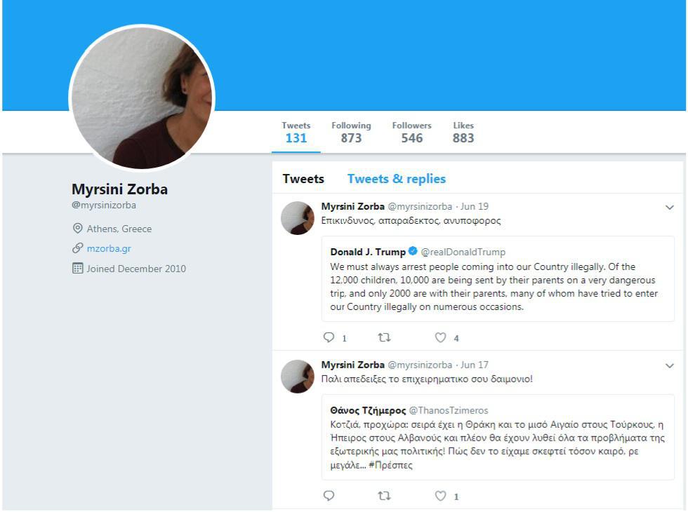 Μπαίνοντας λοιπόν στο twitter παρατηρούμε πως γράφοντας «Myrsini Zorba” στα αποτελέσματα έχει ένα άλλο προφίλ, με πιο πολλά tweets, δημιουργημένο το 2010, και με περιεχόμενο στα ελληνικά.