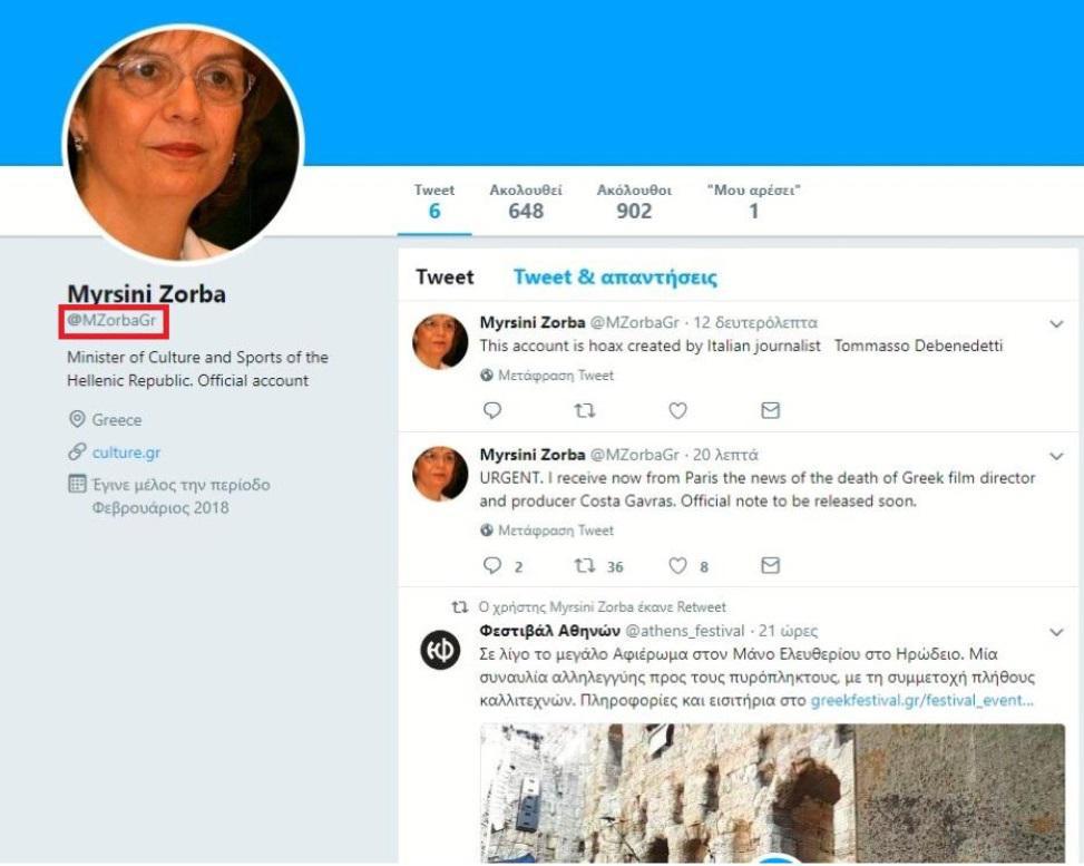 Ενώ το προφίλ που φαίνεται να χρησιμοποιείται από την κ. Υπουργό λέγεται @myrsinizorba, τ προφίλ που δημοσίευσε την «είδηση» λέγεται @MZorbaGr έχει μόνο 6 tweets, τα περισσότερα στα αγγλικά, δημιουργήθηκε το Φεβρουάριο του 2018 και δεν έχει σχεδόν καθόλου κίνηση.