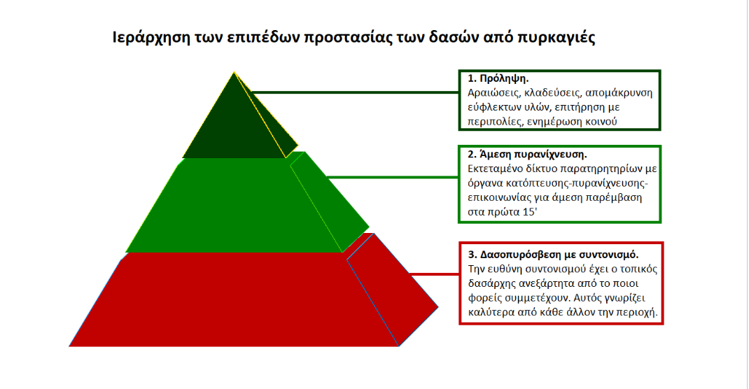 Η παγκόσμια επιστημονική κοινότητα, βασισμένη σε μεγάλο αριθμό ερευνών και μελετών των δασικών πυρκαγιών σε όλον τον κόσμο, καθώς και στους νόμους της φύσης, έχει από χρόνια καταλήξει σε μια ιεράρχηση των τριών επιπέδων προστασίας των δασών από πυρκαγιές (βλ. σχήμα):