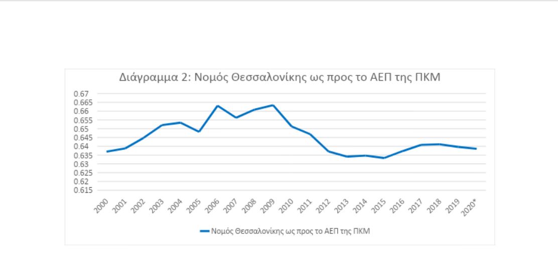 Μάλιστα, συνδυάζοντας το δεύτερο διάγραμμα που παραθέτει το ποσοστό του ΑΕΠ του Νομού ως προς αυτό της Περιφέρειας Κεντρικής Μακεδονίας (ΠΚΜ), χωρίς να αγνοούμε τη σχετική αποτυχία της αναπτυξιακής πολιτικής σε επίπεδο περιφέρειας (η ΠΚΜ υποχώρησε κι αυτή συνολικά περίπου μισή ποσοστιαία μονάδα από το 14% το 2000 στο 13,6% του ελληνικού ΑΕΠ το 2020), το βασικό πρόβλημα επικεντρώνεται στην αδυναμία της Θεσσαλονίκης να ανταποκριθεί στις δυνατότητές της.