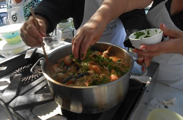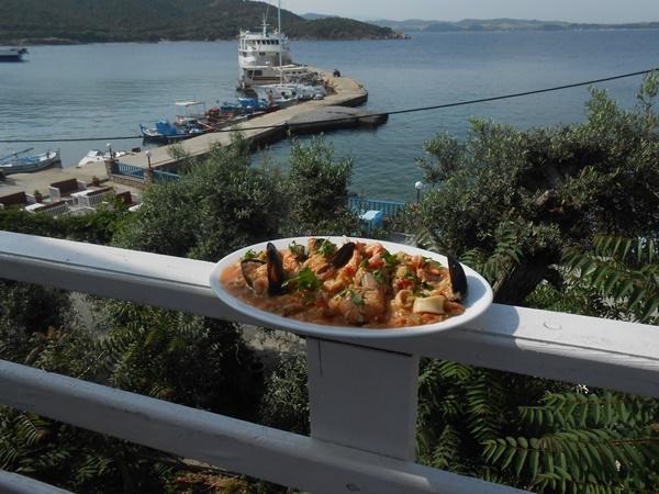 Απολαυστικό το μαθήμα μαγειρικής στο ξύλινο μπαλκόνι της Ανεμότρατας με θέα τις ψαρόβαρκες στο λιμανάκι. Η κυρία Ελένη και η κυρία Ρούλα μας έδειξαν πώς να φτιάχνουμε μπακαλιάρο φρικασέ και κριθαρώτο με καραβίδες και θάλασσινα και το εστιατόριο πρόσθεσε στο τραπέζι μας ένα πολύ ιδιαίτερο πιάτο με μύδια σαχανάκι και τα πιο νόστιμα αχνιστά μύδια που έχουμε δοκιμάσει ποτέ (χωρίς υπερβολή). Το γεμιστό καλαμάρι που μας έφερε τελευταία στιγμή η Μαρία ήταν η νοστιμότατη τελευταία πινελιά στο τραπέζι των θαλασσινών που ολοκλήρωσε το μάθημα μαγειρικής.