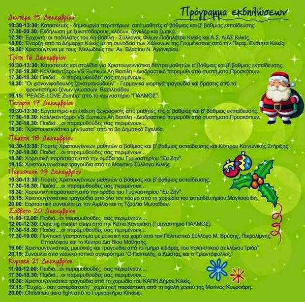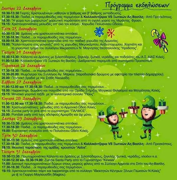 Τα χάλκινα της Γουμένισσας και οι Μωμόγεροι του Αγίου Μάρκου κατεβαίνουν στο Κιλκίς στις 26 Δεκεμβρίου. Κάθε μερα μέχρι τότε αλλά και μετά μέχρι τις 31 Δεκεμβρίου ξυλοπόδαροι, Αϊ-Βασίλης, ξωτικά, καλικάντζαροι θα είναι εκεί, ζεστό τσάι, κρασί, κεράσματα, παιχνίδια για παιδιά, παραμύθια, δράσεις, παιδικές χορωδίες, χορευτικά θα συμβάλλουν στην χριστουγεννιάτικη ατμόσφαιρα της Πλατείας Ειρήνης στο Κιλκίς.