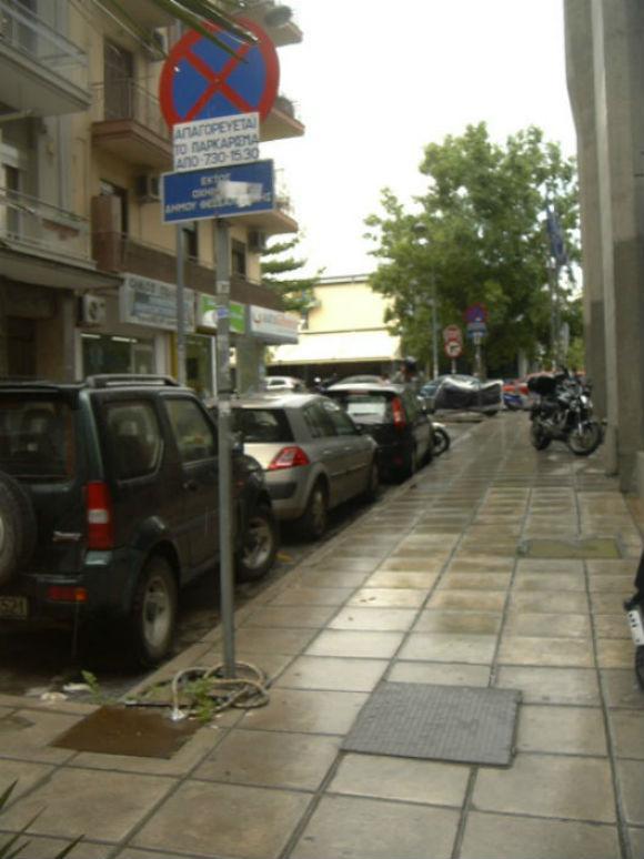 Την ίδια στιγμή, πολύ φυσικά, η Αντιδημαρχία Αρχιτεκτονικού (κτίριο οδού Αγγελάκη), που σχεδίασε και υλοποίησε τις πρόσφατες πεζοδρομήσεις, διατηρεί ως κόρην οφθαλμού καμιά δεκαριά θέσεις στάθμευσης, για υπηρεσιακά οχήματα αλλά και για οχήματα των υπαλλήλων της! (με την γνωστή λογική, δικό μου το πεπόνι, δικό μου και το μαχαίρι…) Επίσης, ο Δήμος εξακολουθεί να επιτρέπει τη δέσμευση θέσεων στάθμευσης για τουλάχιστον 4 αυτοκίνητα της ΕΡΤ3 στην Αγγελάκη (που θα μπορούσαν να σταθμεύουν στο παρακείμενο πάρκινγκ της ΔΕΘ, από την οποία άλλωστε μισθώνει τη στέγη της η ΕΡΤ3), για 2 αυτοκίνητα του Δημοτικού Ραδιοφώνου FM100 (πάλι στην Αγγελάκη, σε χώρο μισθωμένο επίσης από τη ΔΕΘ), για 2 αυτοκίνητα των ΕΛΤΑ (αν και ποτέ δεν σταθμεύουν εκεί υπηρεσιακά οχήματα), για 3-4 αυτοκίνητα της ΔΕΗ στην οδό Εθνικής Αμύνης, όταν τριγύρω υπάρχουν αρκετά πάρκινγκ που η ΔΕΗ θα μπορούσε να χρησιμοποιήσει, πληρώνοντας φυσικά, ακριβώς όπως οι κάτοικοι του κέντρου καλούνται να κάνουν. Προφανώς, ο Δήμος πιστεύει ότι ένας ιδιώτης μπορεί ευκολότερα να πληρώσει ―ειδικά σήμερα― μια θέση σε ιδιωτικό πάρκινγκ σε σχέση με τη ΔΕΗ.