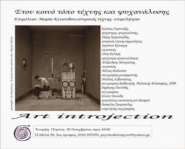 Ποιος είναι ο κοινός τόπος της τέχνης και της ψυχανάλυσης; Το art introjection μας προσκαλεί να μάθουμε, σε ένα project απευθυνόμενο σε αποφοίτους, ή φοιτητές στα τελευταία έτη, των Τμημάτων Εικαστικών Τεχνών των Σχολών Καλών Τεχνών, σε συνεργασία με μία ομάδα ειδικών που θα βρεθούν με τους καλλιτέχνες επιδιώκοντας να τον ανακαλύψουν.