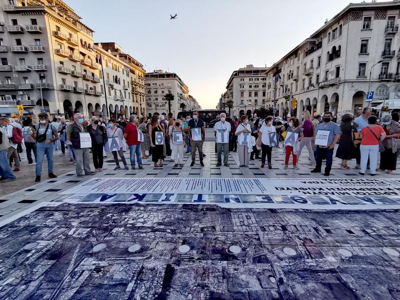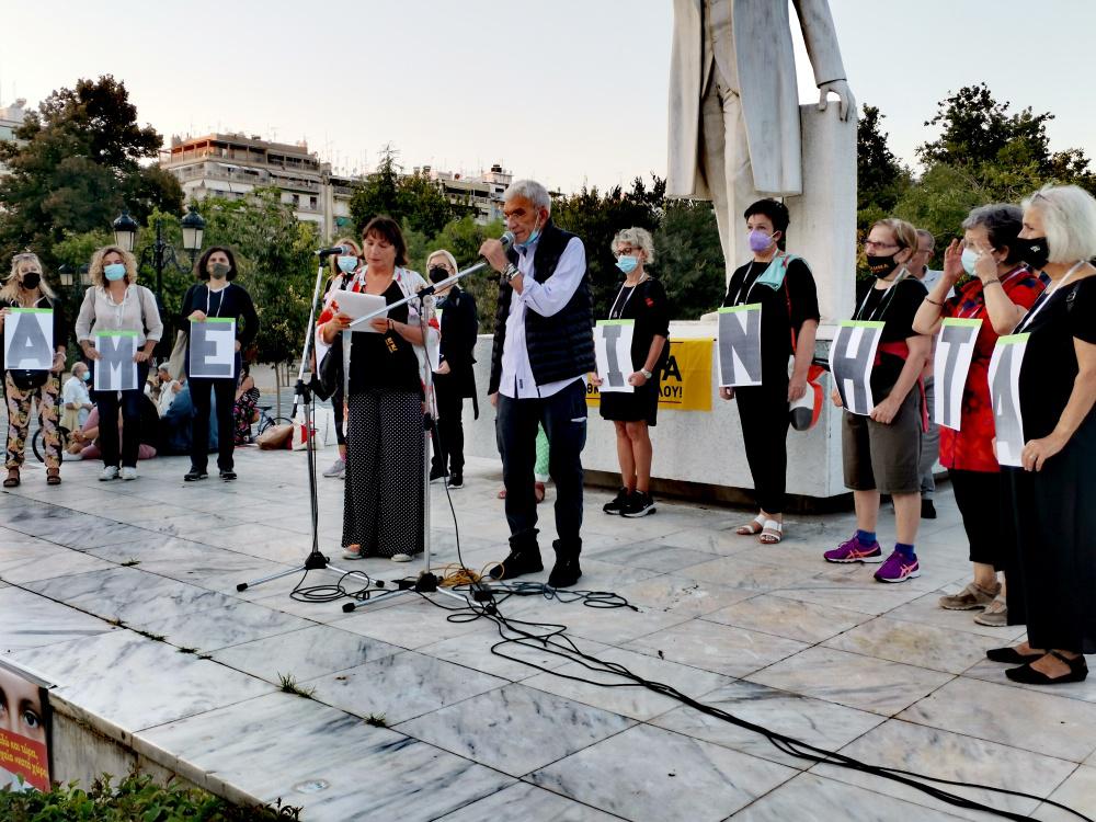 Στις έξι και κάτι ανεβαίνουμε από το γραφείο προς το άγαλμα το Βενιζέλου, όπου υπάρχουν ήδη τα πανό, αφίσες, σχέδια και συνθήματα γραμμένα με το χέρι πάνω σε χαρτόνια. Ο κόσμος που ήρθε αφιέρωσε χρόνο, όχι μόνο με τη στενή έννοιά του, δηλαδή να μετακινηθεί στο χάος του κέντρου ενόψει ΔΕΘ και να συμμετέχει στην εκδήλωση, αλλά χρόνο με την έννοια της διάθεσης, με τη λαχτάρα που είχαμε ως παιδιά να φτιάξουμε ένα πανό-χαρτόνι για έναν αγαπημένο μας αθλητή ή για την ομάδα της τάξης στο σχολικό τουρνουά.