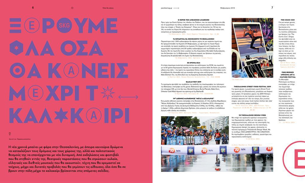 Η Parallaxi Φεβρουαρίου 2019 είναι εδώ και φέρνει μαζί της τον καλύτερο οδηγό για την νέα σεζόν στην πόλη. Όλα τα events, φεστιβάλ, θεατρικές παραστάσεις, μουσικές εκδηλώσεις, εκθέσεις και κινηματογραφικοί θεσμοί που σε περιμένουν στη Θεσσαλονίκη μέχρι το καλοκαίρι θα σε βρουν εντός της. Και φυσικά η κορυφαία γιορτή “Οι Δρόμοι του Κουδουνιού”, που φτάνει κάθε χρόνο στην πόλη, ξεδιπλώνοντας έθιμα και γεμίζοντας τους δρόμους με εκατοντάδες κωδωνοφόρους από κάθε γωνιά της Ελλάδας και της Ευρώπης, σε περιμένει να την ανακαλύψεις.