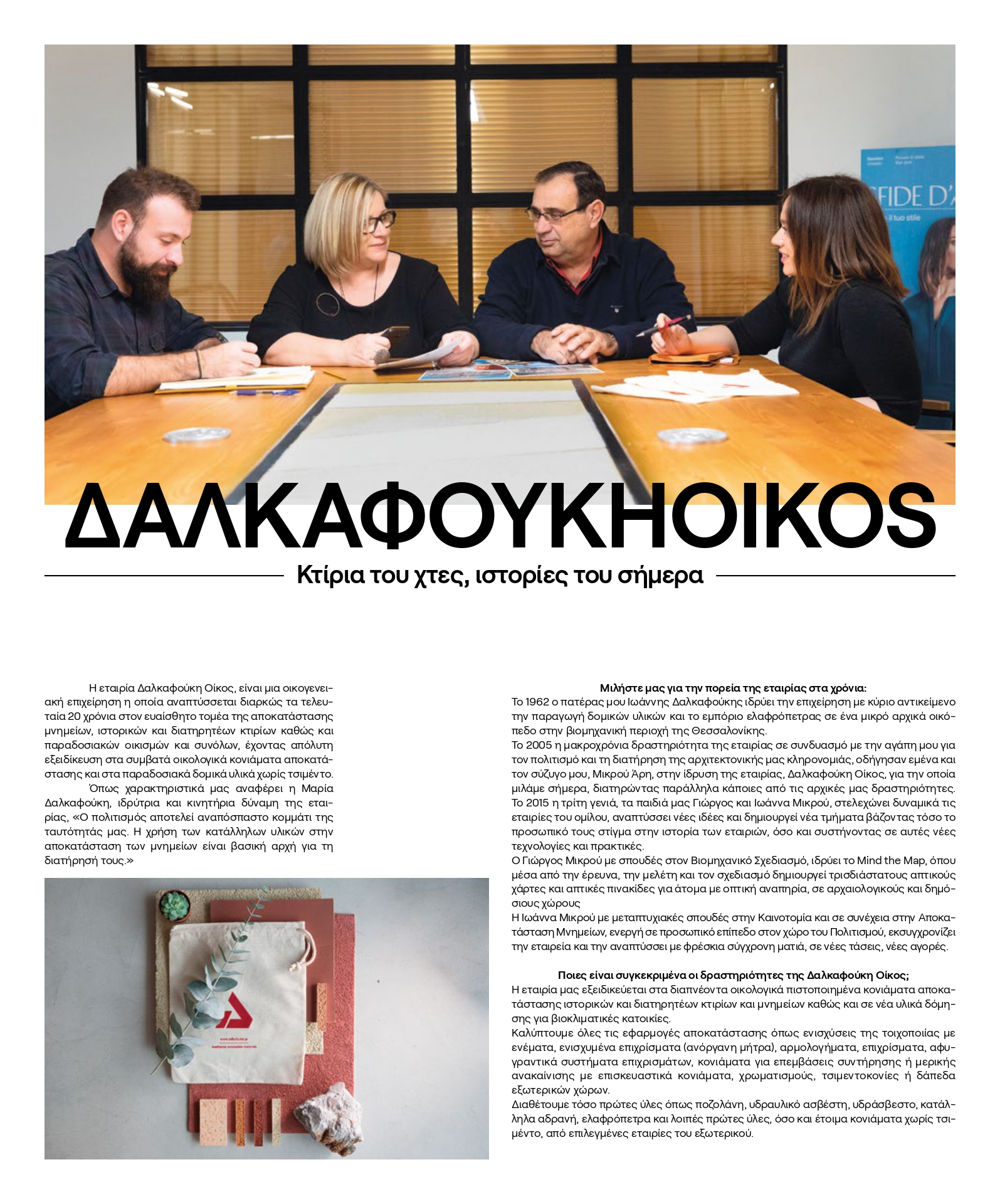 Η Μαρία Δαλκαφούκη, ιδρύτρια και κινητήρια δύναμη της εταιρίας, μιλά για μια οικογενειακή επιχείρηση η οποία αναπτύσσεται διαρκώς τα τελευταία 20 χρόνια στον ευαίσθητο τομέα της αποκατάστασης μνημείων, ιστορικών και διατηρητέων κτιρίων καθώς και παραδοσιακών οικισμών και συνόλων.