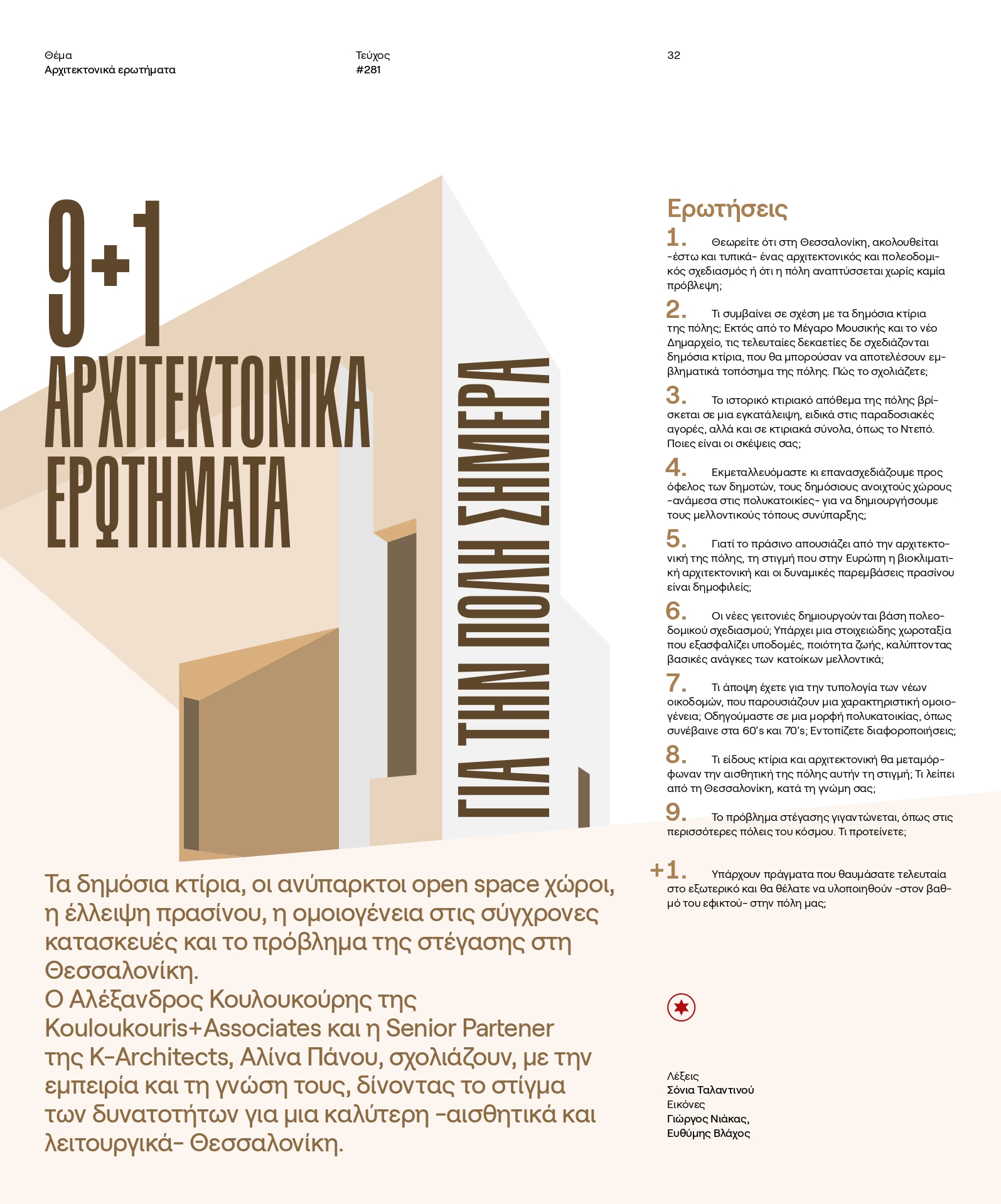 Ο Αλέξανδρος Κουλουκούρης της Kouloukouris+Associates και η Senior Partener της K-Architects, Αλίνα Πάνου, σχολιάζουν, με την εμπειρία και τη γνώση τους, δίνοντας το στίγμα των δυνατοτήτων για μια καλύτερη -αισθητικά και λειτουργικά- Θεσσαλονίκη.